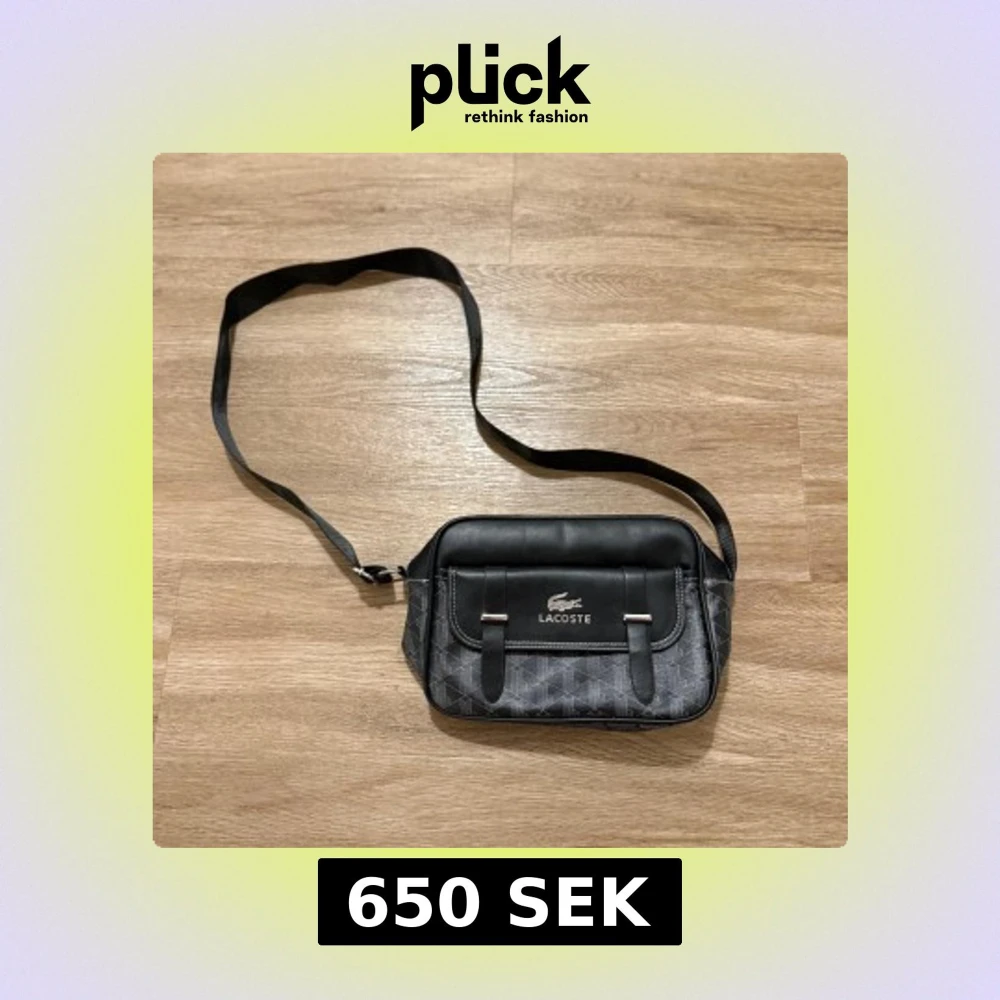 Snygg svart axelväska från Lacoste med geometriskt mönster och justerbar rem med logotyp. Väskan har ett lock med två dekorativa remmar och silverfärgade detaljer. Insidan är ljus och har en diskret Lacoste-logga. Perfekt för att bära dina essentials.