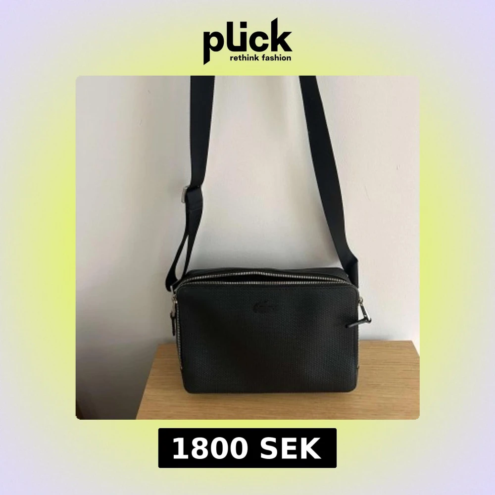 Snygg svart axelväska från Lacoste med diskret krokodillogga på framsidan. Väskan har justerbar rem, silverfärgade dragkedjor och ett strukturerat yttertyg. Insidan är fodrad i grönt tyg med innerfack och dragkedja. Perfekt för att bära det viktigaste.