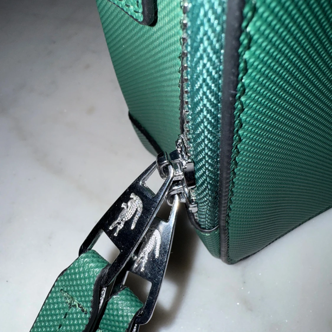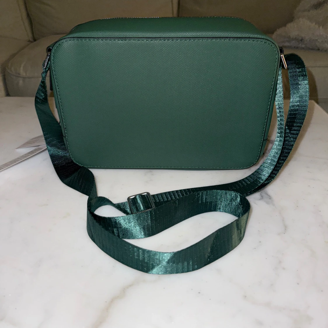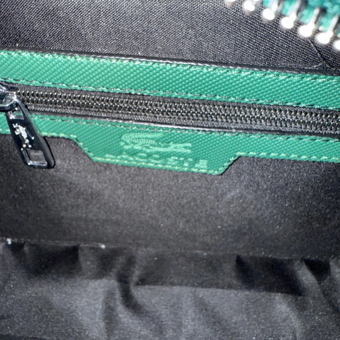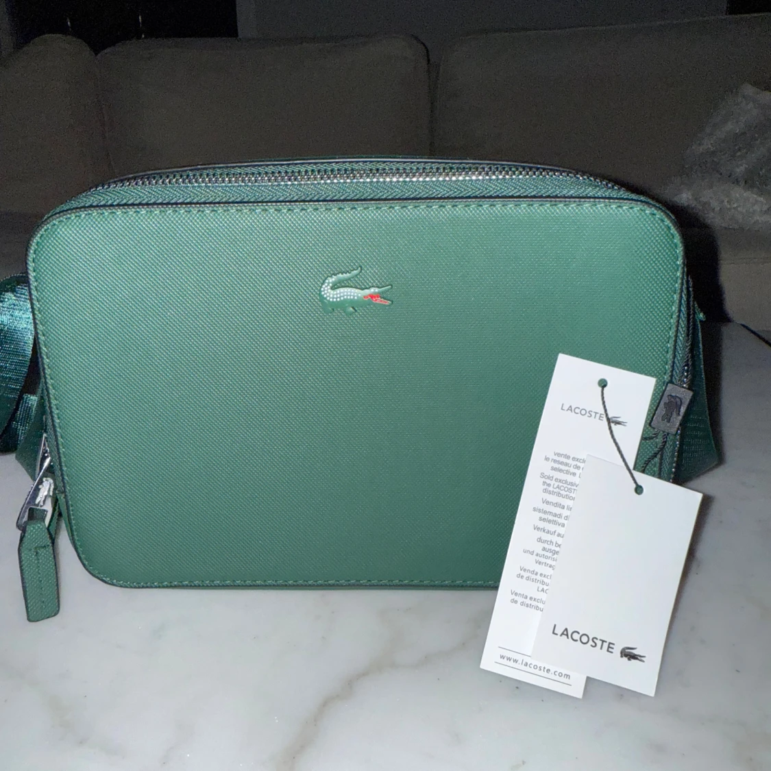 Snygg grön axelväska från Lacoste med klassisk krokodillogga framtill. Väskan har en justerbar axelrem i glansigt material, silverfärgade dragkedjor med logga och ett rymligt fack med innerficka. Tillverkad i slitstark syntet med stilren, boxig form.