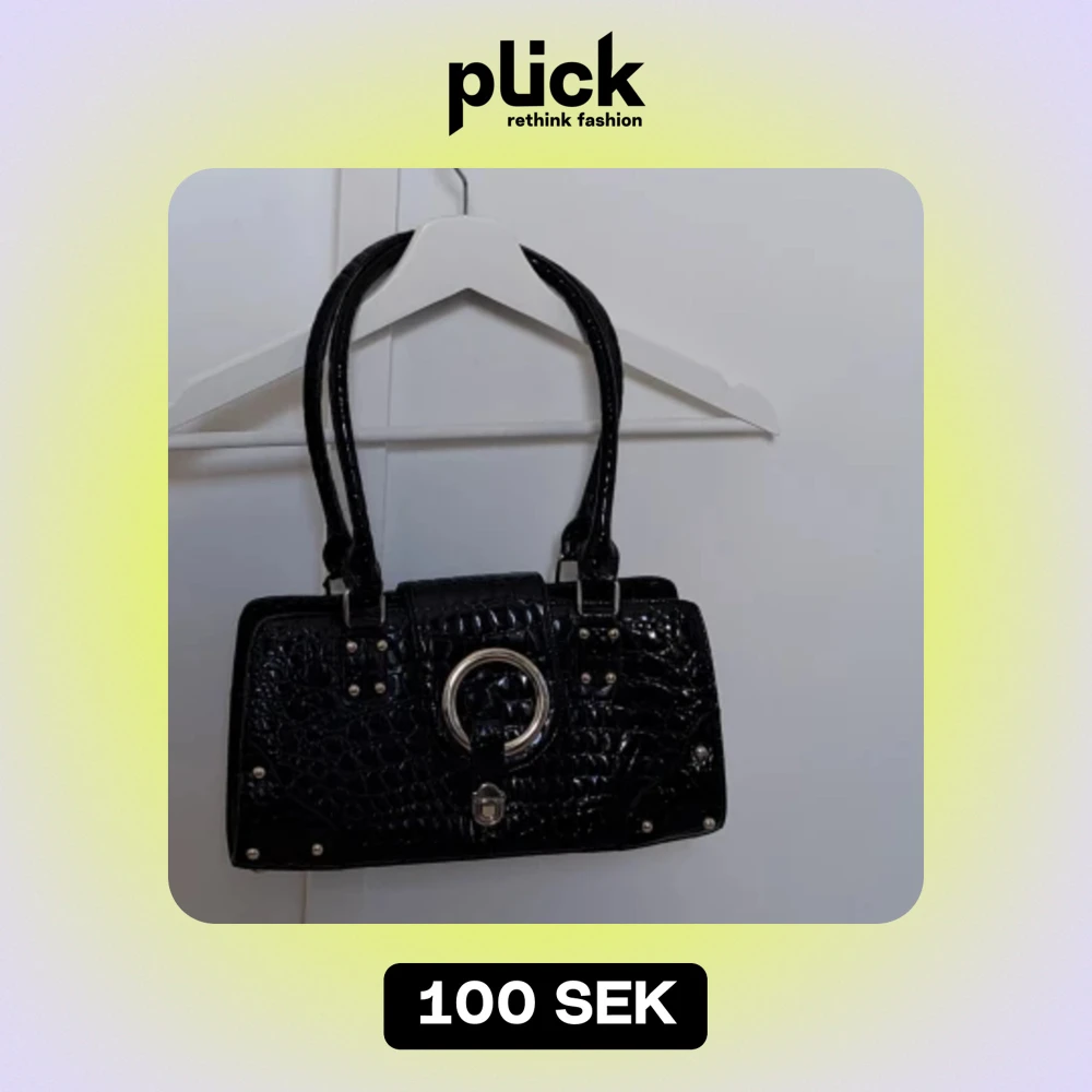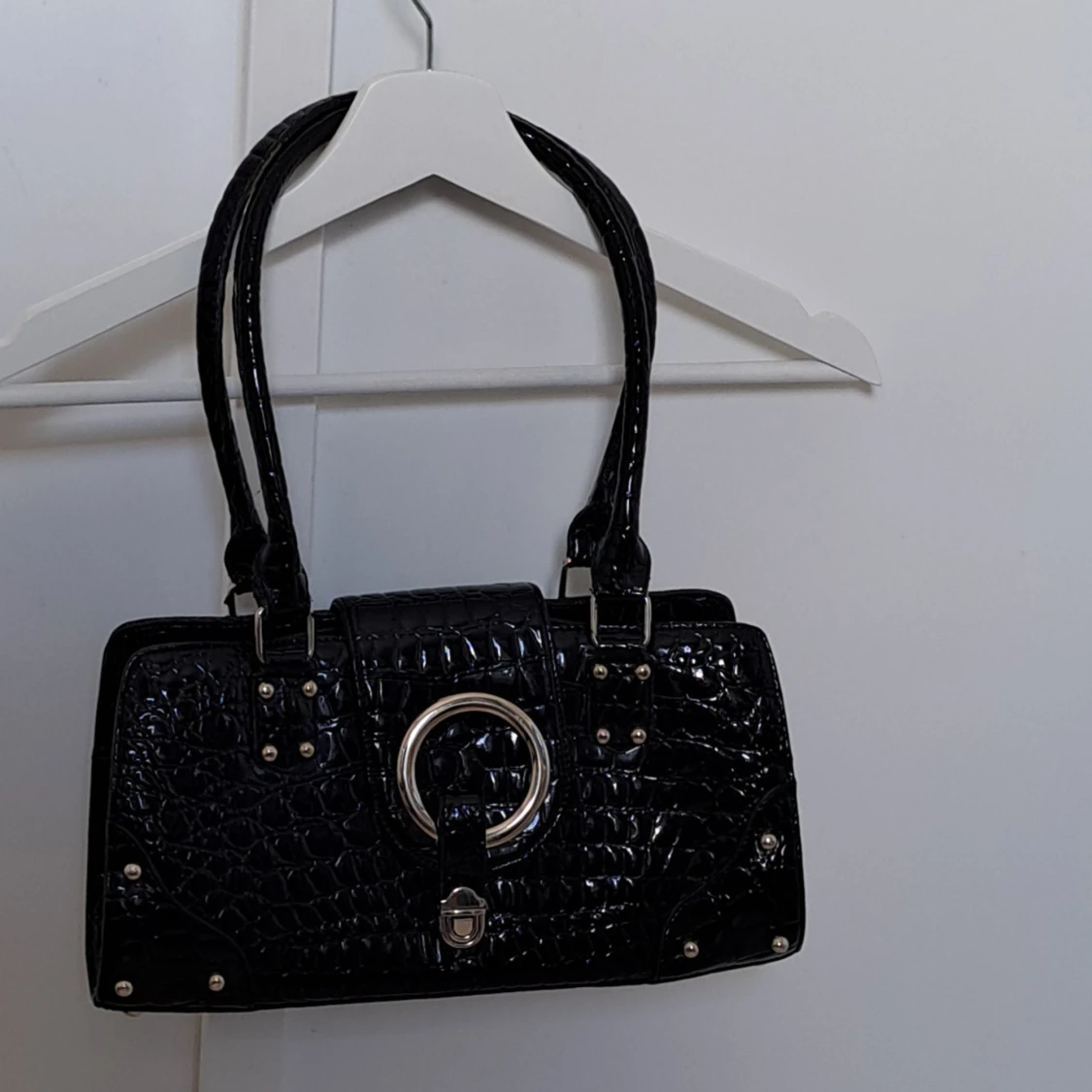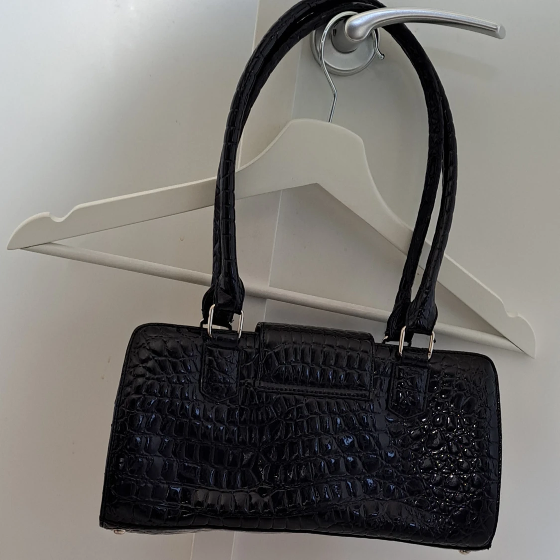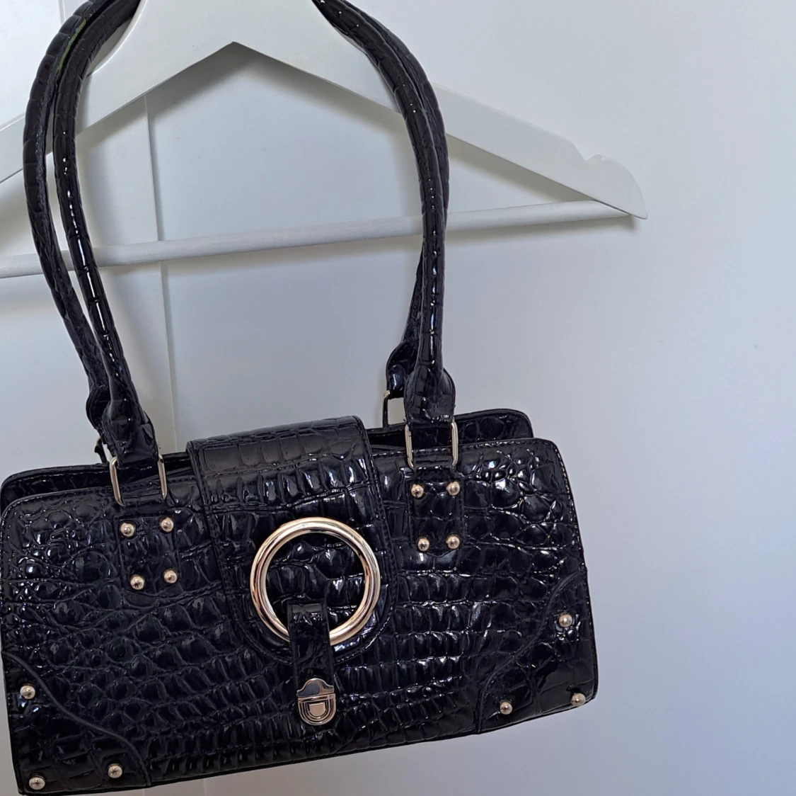 Medelstor axelväska i imitationsläder med krokodilmönster. Har ett spänne vid mitten som gör den perfekt att hänga bagcharms i. Fick ärva den av en kompis, så vet inte var den kommer ifrån.