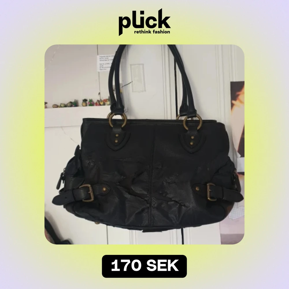 Jätte snygg svart läder väska med gulddetaljer, perfekt till skolan💞 Den är lite sliten som ni ser på bilden men enligt mig är det inget som stör, den är i jätte bra skick inuti.