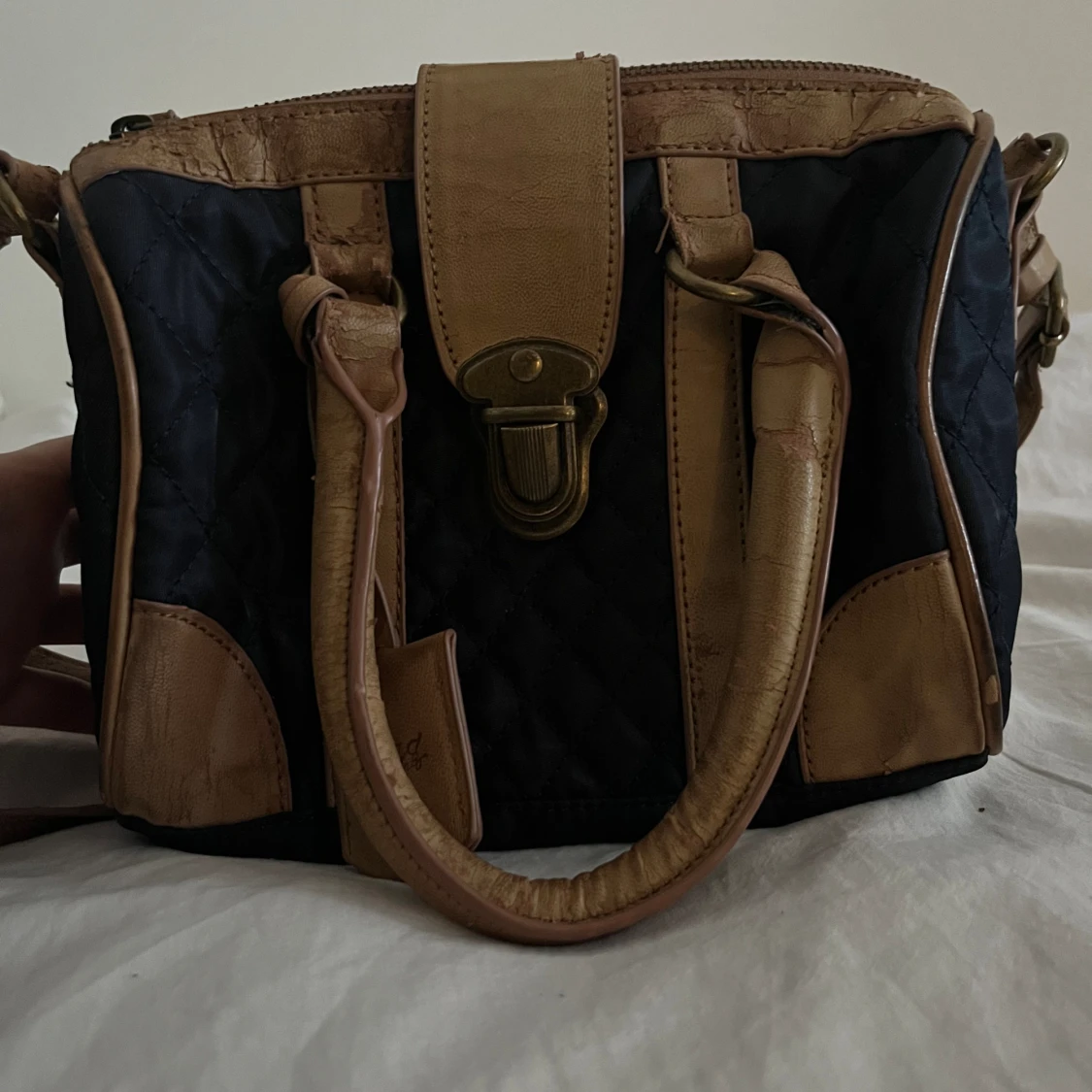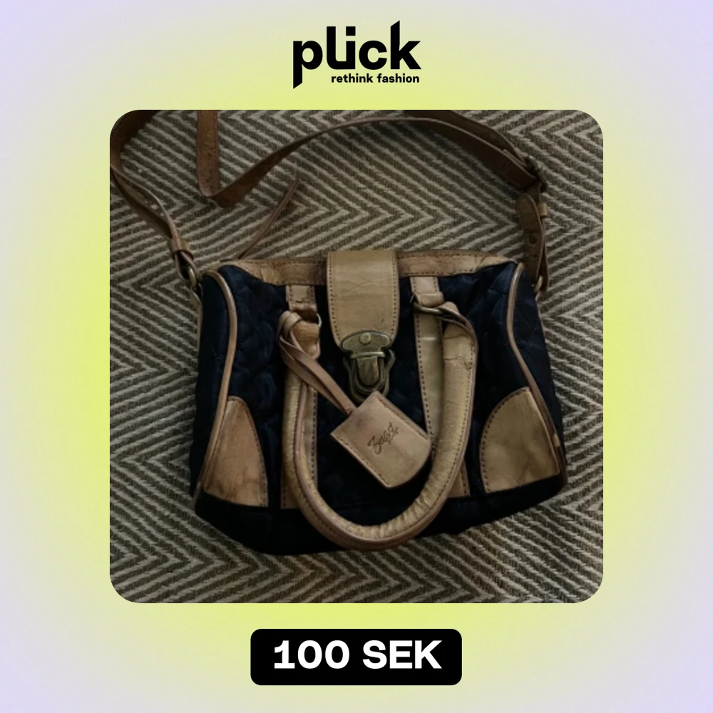 Lite torrt läder men bra skick. Köpt på Sellpy för 200 kr. Ingen bra regeringsbild men väskan är ca 25 cm bred. Mörkblå och ljust läder.