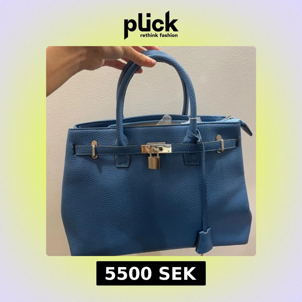 Snygg blå handväska i strukturerat skinn med silverfärgade metalldetaljer och ett coolt hänglås framtill. Väskan har två rejäla handtag och metallfötter undertill för extra stabilitet. Köpt secondhand, så oklart om den är äkta, därav priset.