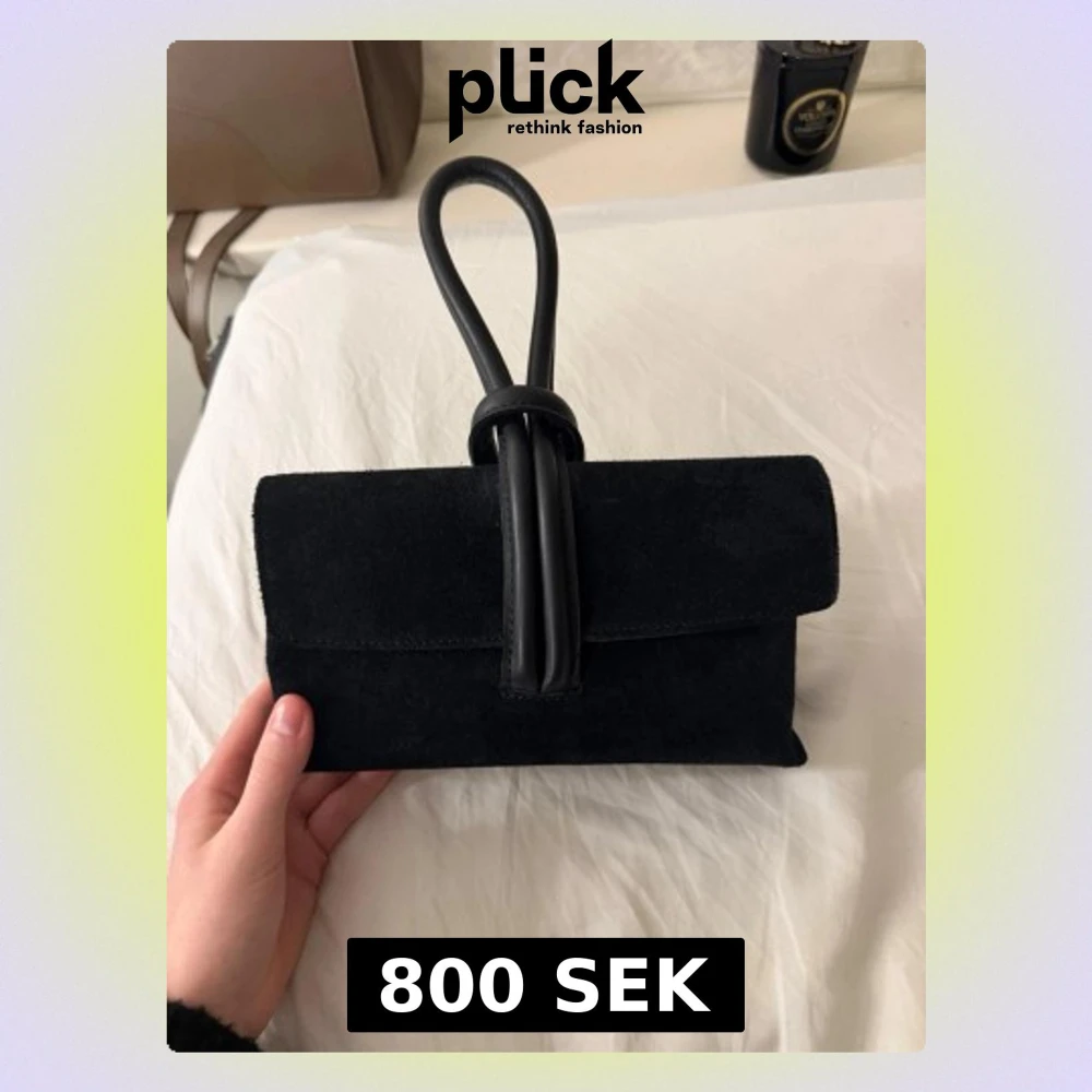 Stilren svart kuvertväska i mocka med unik knutdetalj på handtaget. Väskan har en rektangulär form och stängs med ett lock. Perfekt accessoar för att lyfta din outfit med en cool twist.