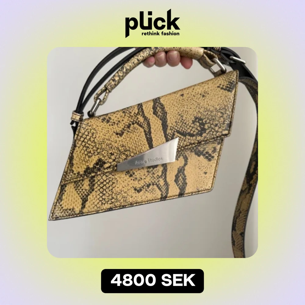 Acne Studios yellow distortion mini bag is made of python print 100% leather with a crossbody shoulder strap. It can also be carried as a handbag. Slightly broken on left side, see images. Width: 20 cm Height: 14 cm (with handle) Depth: 9cm