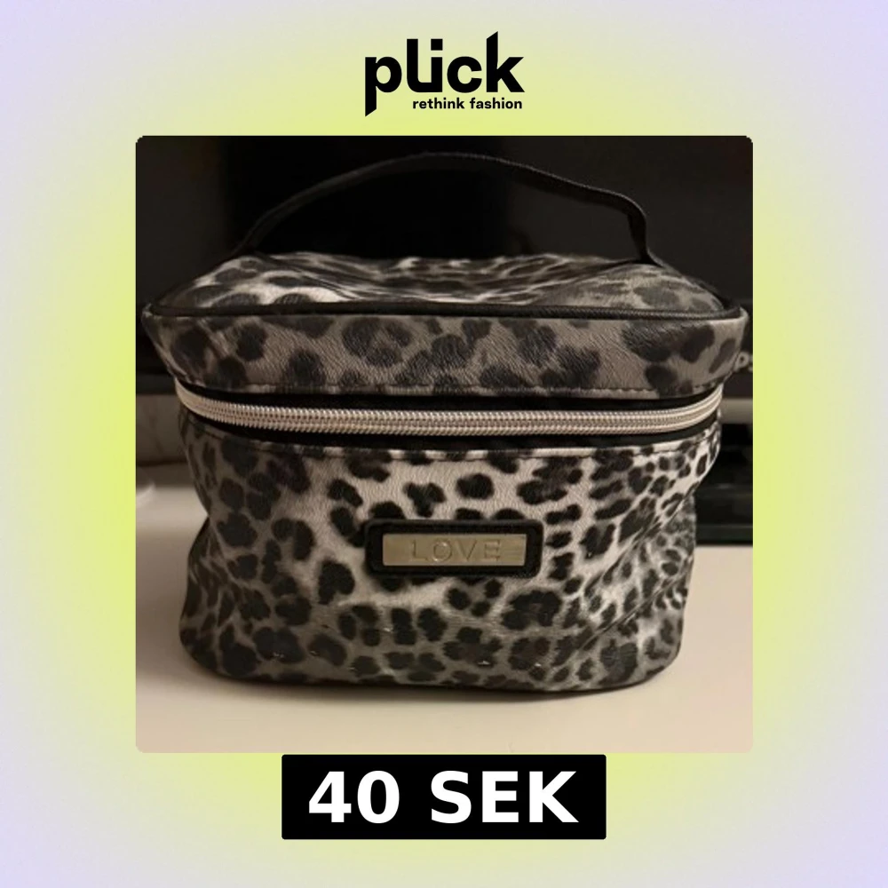 Snygg och praktisk handväska med leopardmönster i svart och grå toner. Väskan har en dragkedja runt locket och ett handtag upptill, perfekt för att bära med sig smink eller småprylar. Märke i metall framtill ger extra stilpoäng.