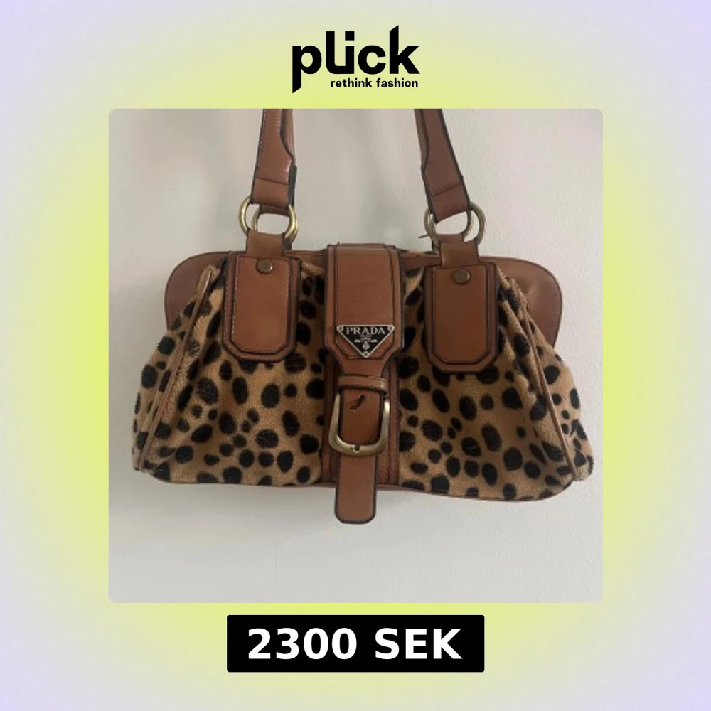 Snygg leopardmönstrad handväska från Prada med bruna skinnremmar och detaljer. Väskan har en dragkedja och ett elegant spänne framtill. Perfekt för att ge din outfit en lyxig touch.