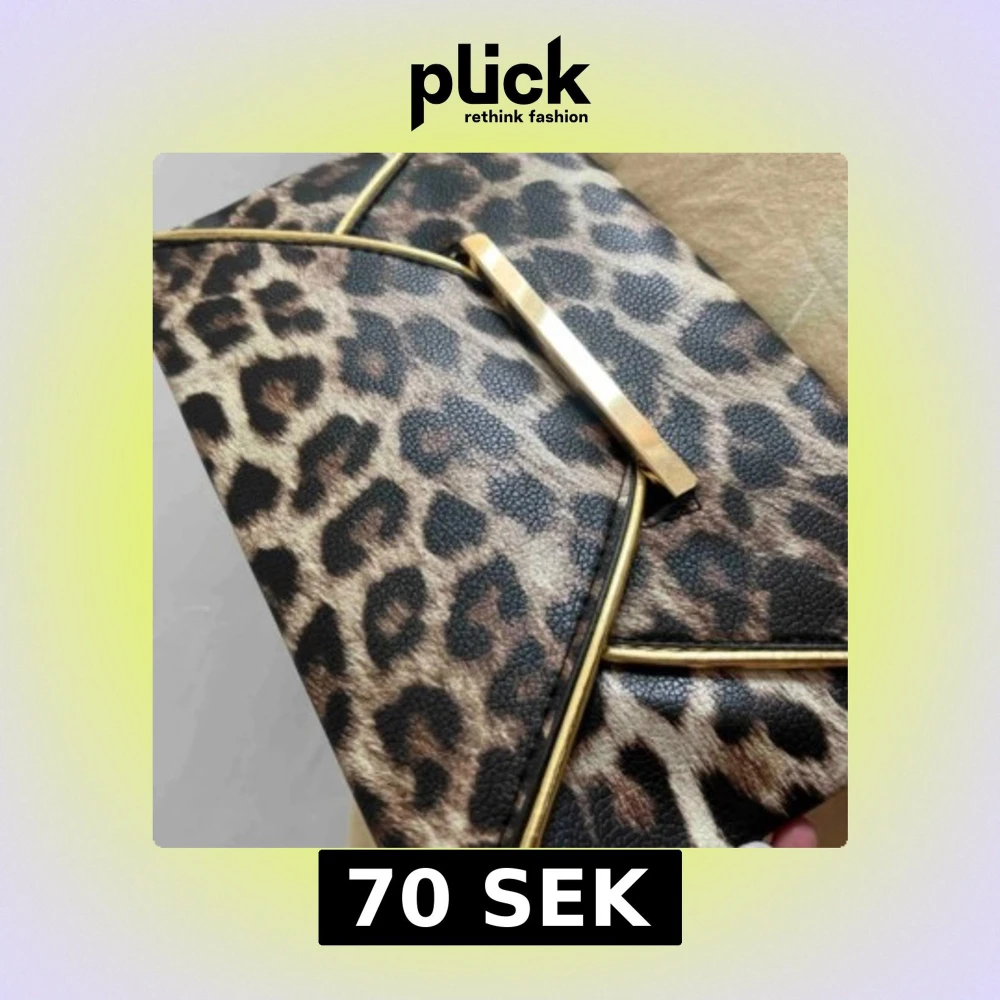 Snygg kuvertväska i leopardmönstrat syntetmaterial med guldfärgade metalldetaljer. Väskan är 28x18 cm och har ett stilrent svart foder. Perfekt accessoar.