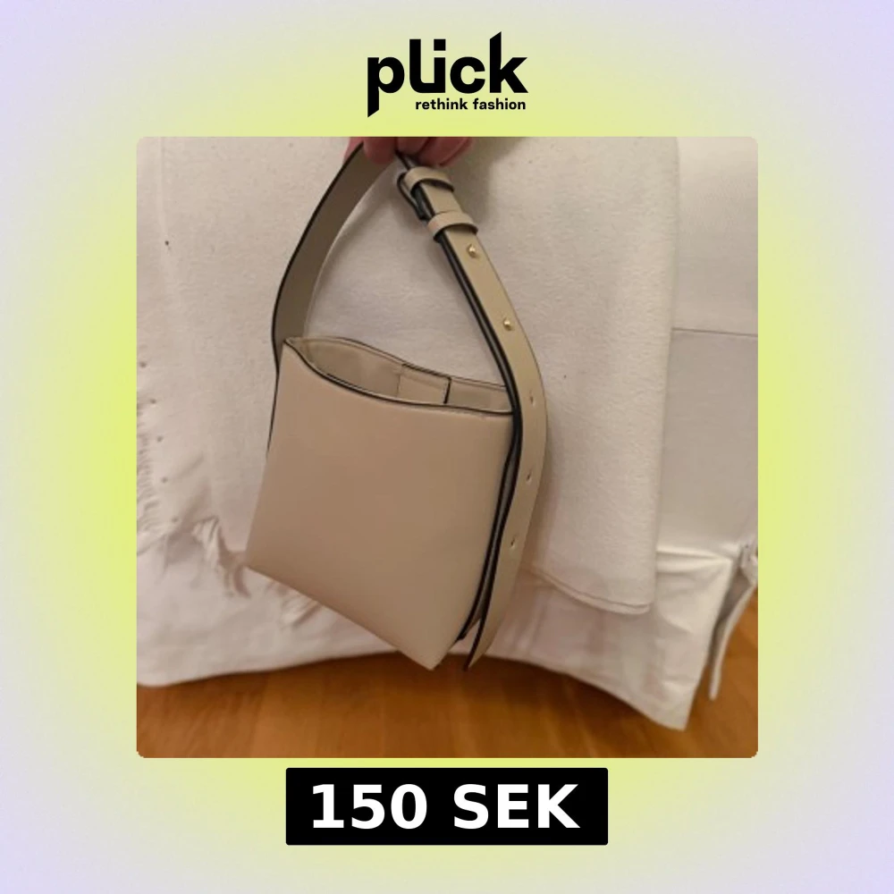 Snygg beige axelväska från Lindex med stilren, boxig form och justerbart axelband med guldfärgade detaljer. Väskan har magnetknäppning och insida med fästen för extra rem.