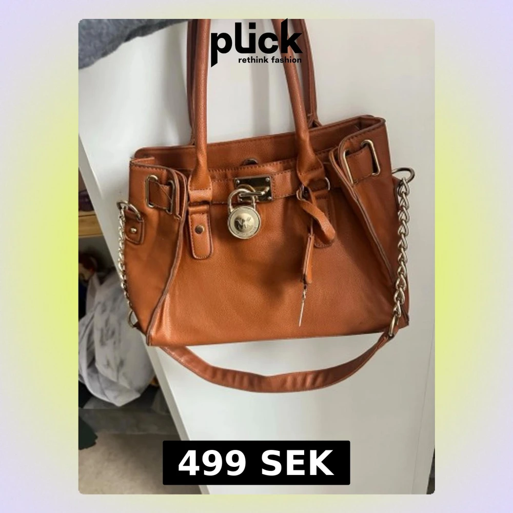 Snygg brun handväska med guldfärgade metalldetaljer och kedja på axelremmen. Väskan har låsdetalj framtill och flera fack inuti med tygfoder. Perfekt för dig som vill ha en trendig och rymlig väska.