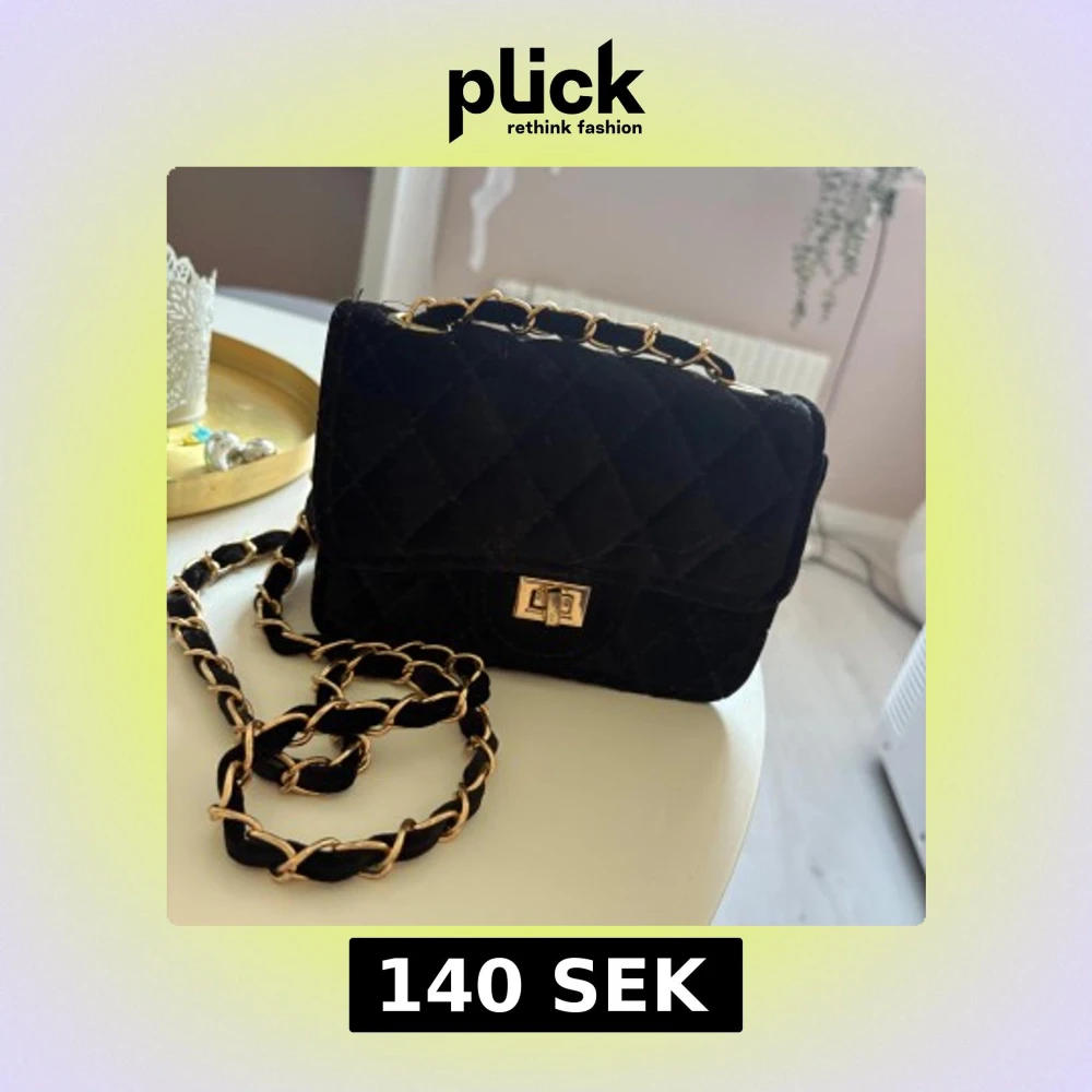 Snygg svart axelväska i quiltad sammet med guldfärgad kedja och vridlås framtill. Väskan har en klassisk rektangulär form och kedjan är flätad med svart tyg för extra stilpoäng. Perfekt för att lyfta din outfit med en elegant touch. Banden går att ändra till långt eller till två kortare beroende på hur man vill bära den🤗