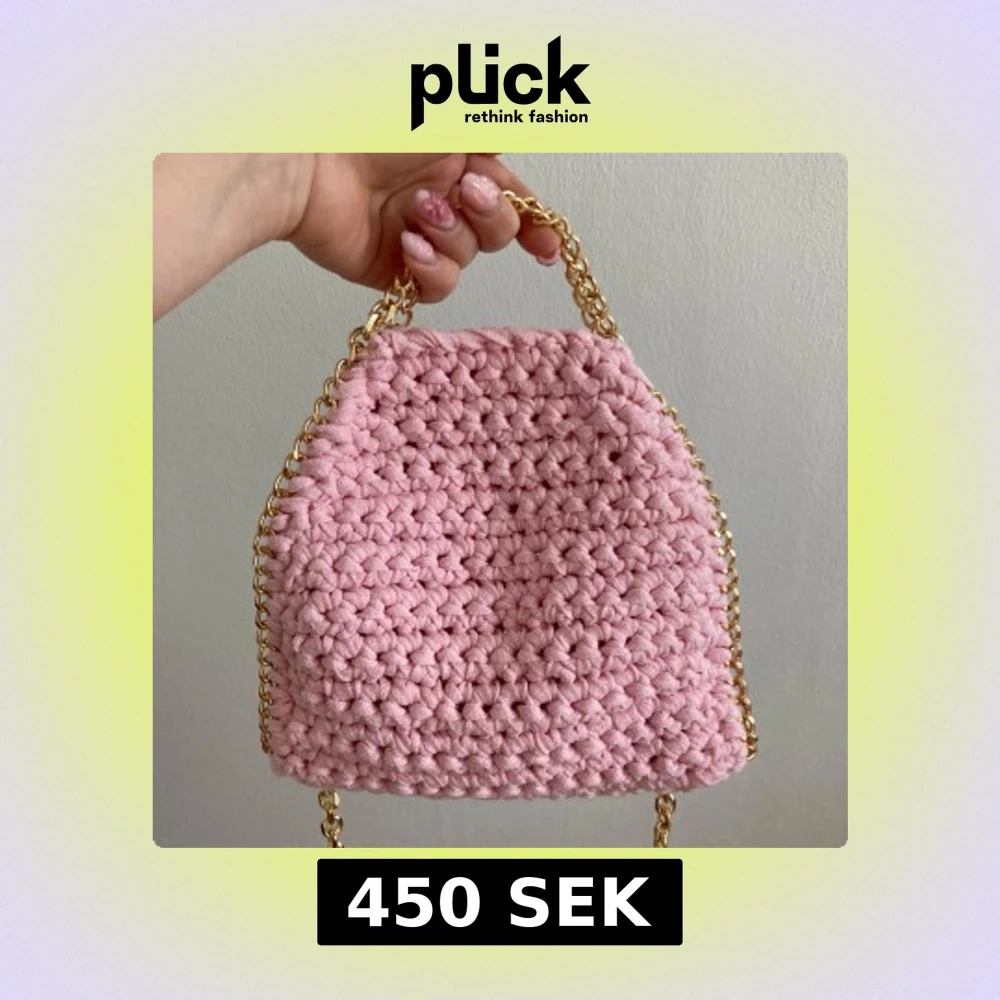 Supersöt handgjord axelväska i ljusrosa stickat material med chunky guldfärgad kedja som axelrem. Väskan har en mjuk, virkad look och är perfekt för att lyfta din outfit med en gullig touch. Liten och smidig storlek, passar till mobilen och det viktigaste. Handgjord av mig. För fler bilder skriv till mig