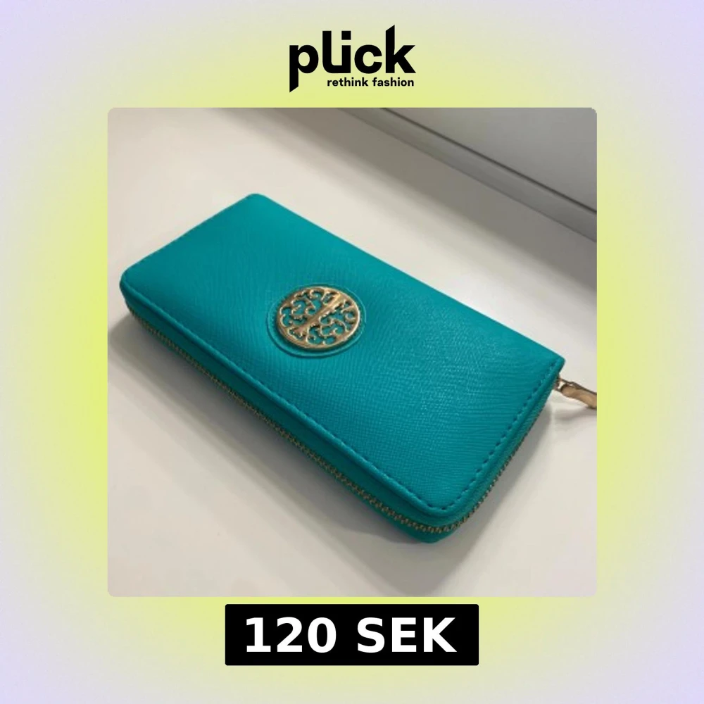 Snygg turkos plånbok med guldfärgad dragkedja och en cirkel av ett träd i mitten på framsidan. Plånboken har flera fack för kort, sedlar och mynt, samt ett innerfack med dragkedja. Super gullig för både vardag och fest!