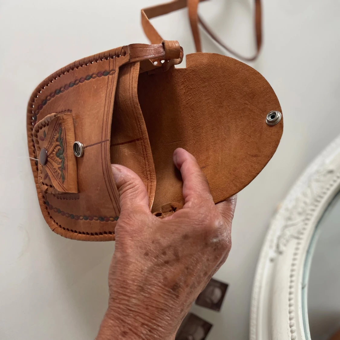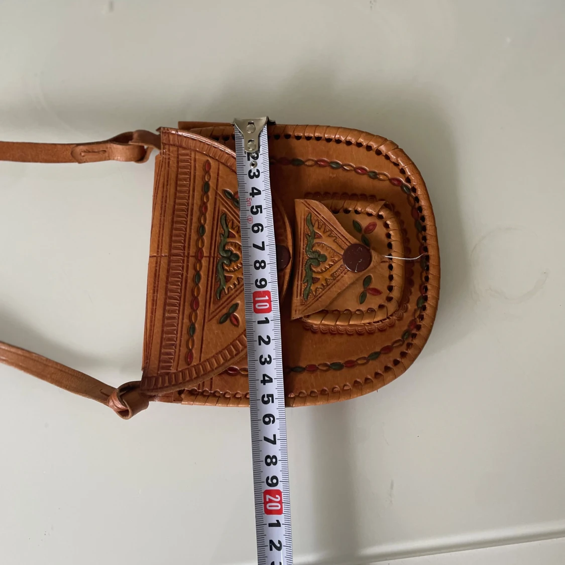 Unik brun axelväska i skinn med handgjorda broderade detaljer i grönt, rött och gult. Väskan har ett lock med tryckknapp, en mindre ficka framtill och dekorativa sömmar runt kanterna. Snyggt mönstrad och perfekt för dig som gillar vintagevibbar.