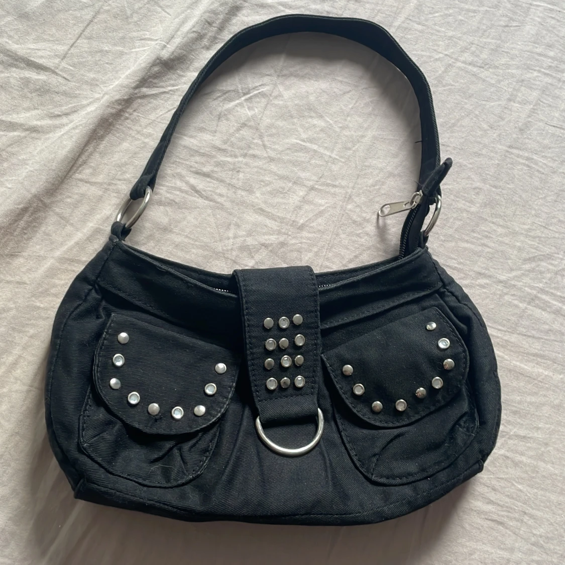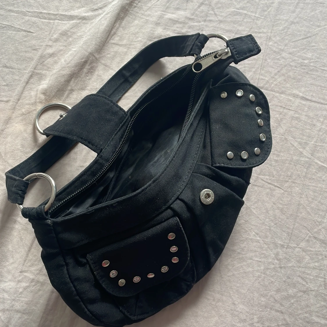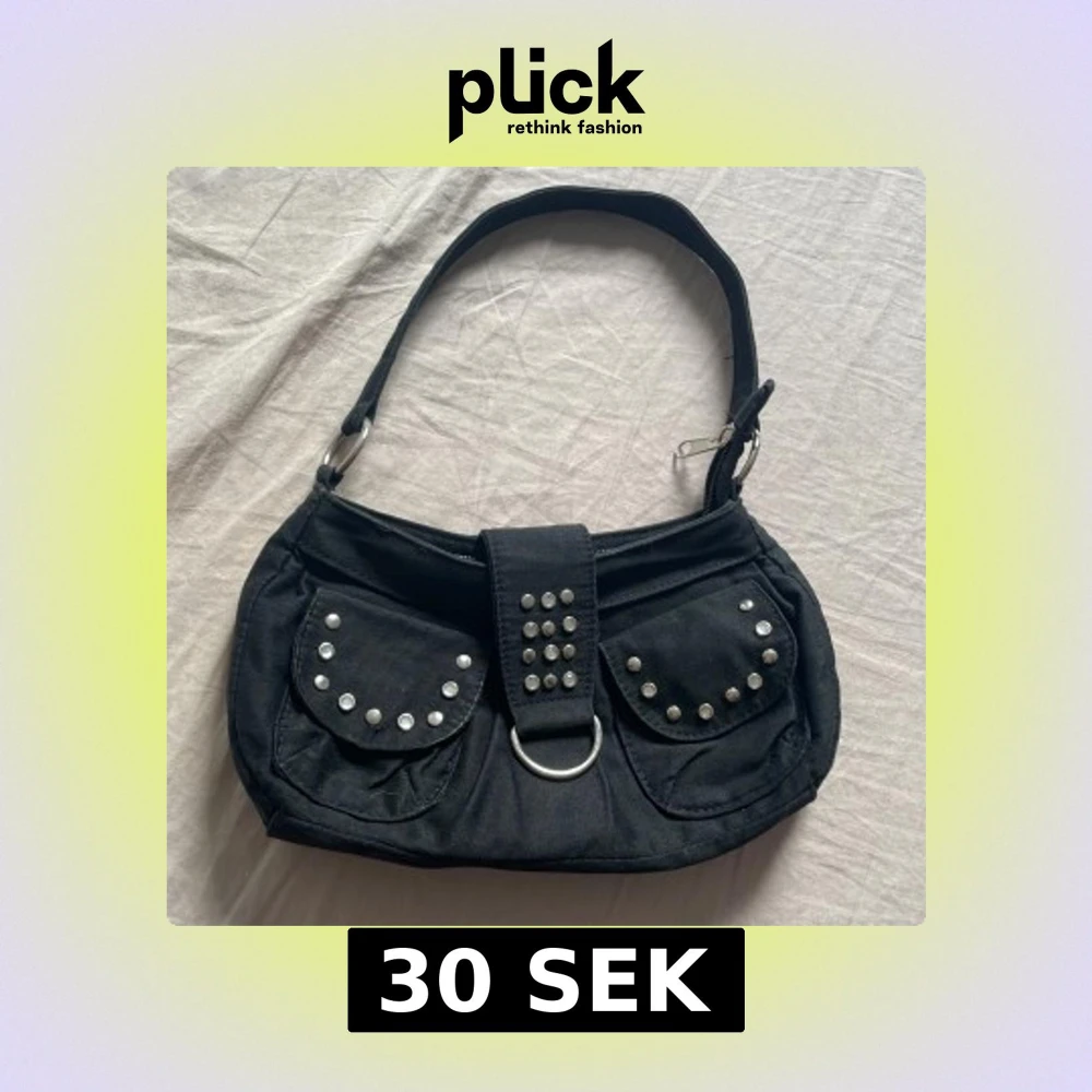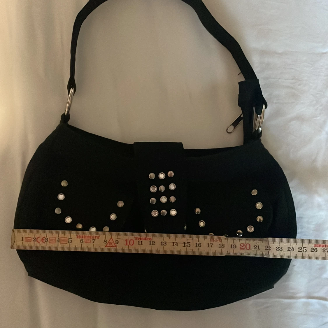 Liten axelväska av tyg med nitar på, köpt på loppis så vet ej märket. Två små fickor på utsidan och en liten på insidan. Katt i hemmet💕