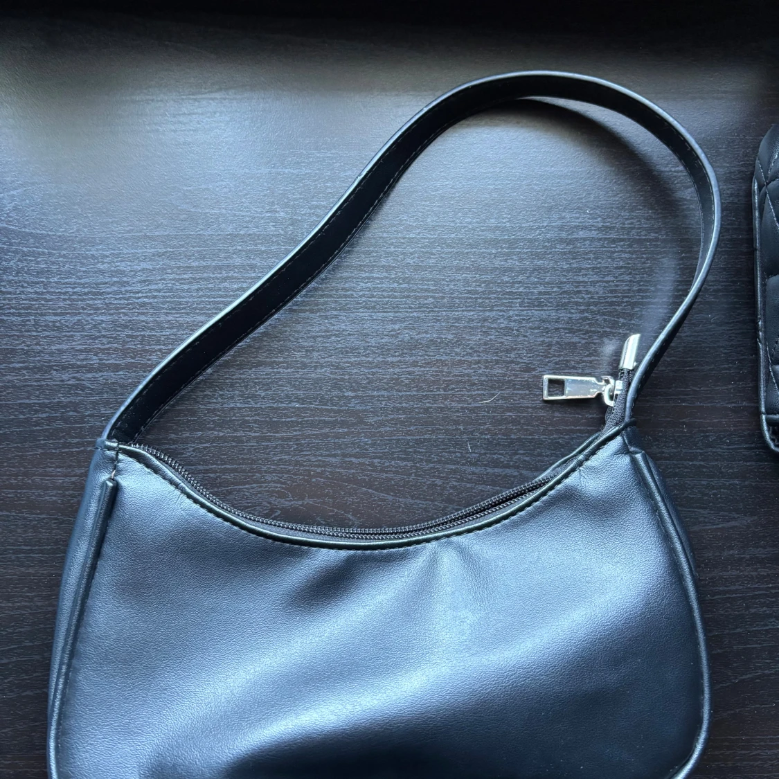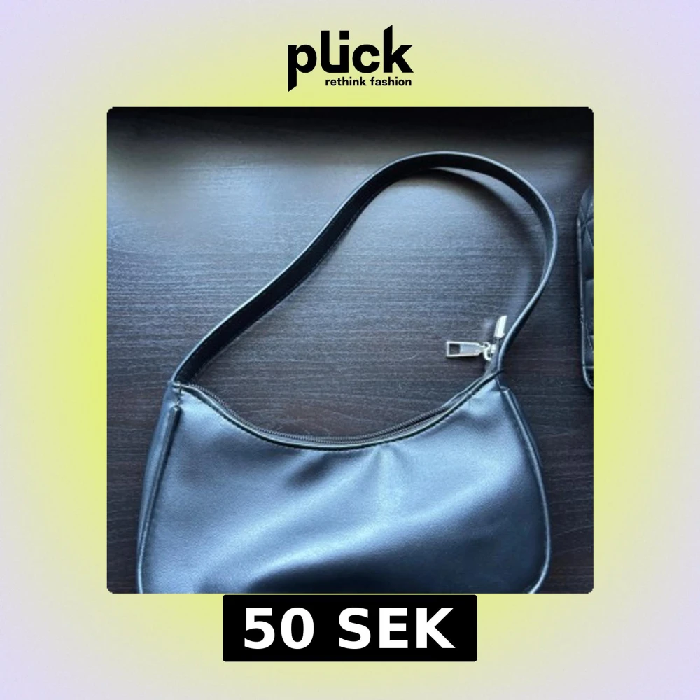 Stilren svart axelväska med enkel design och silverfärgad dragkedja. Väskan har en mjukt rundad form och ett smalt axelband, perfekt för att bära det viktigaste med er. Oklart vilket märke väskan är ifrån då lappen är borta. Aldrig kommit till användning.