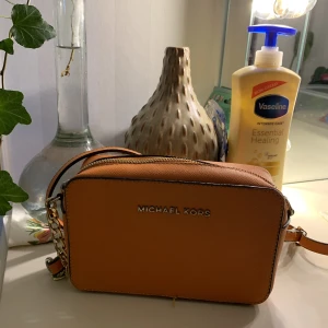 Lite handväska som är orange, med långt band som man kan ha på axeln eller runt om