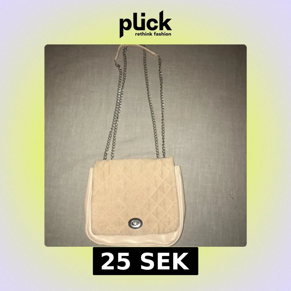 Snygg beige axelväska med quiltat mönster och silverfärgad kedja. Väskan har en praktisk stängning med ett metallspänne framtill. Perfekt för att ge en stilren touch till din outfit.