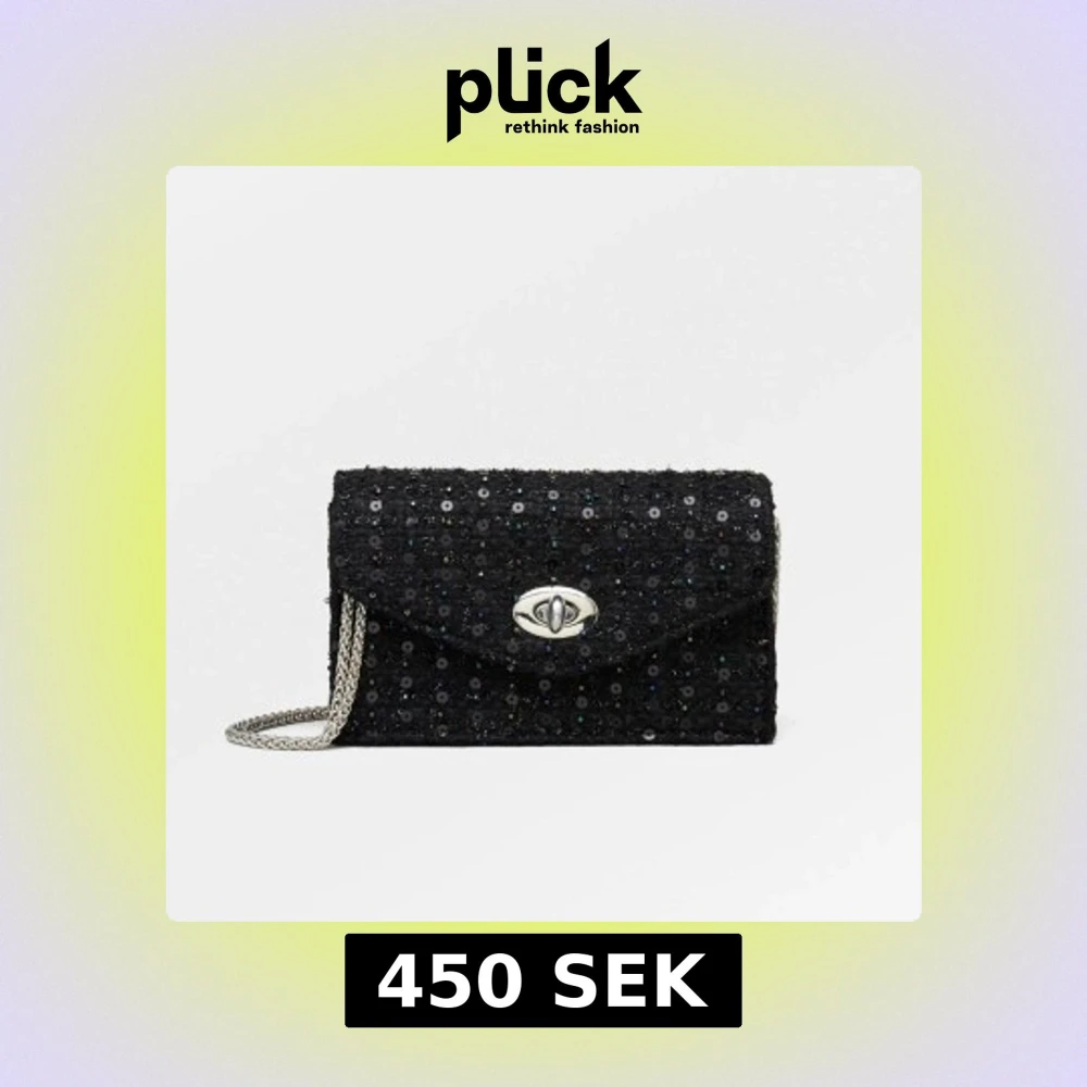 Snygg svart kuvertväska med glittriga paljetter och silverfärgad kedja. Väskan har ett vridlås i metall och ett huvudfack med innerficka. Använt få gånger, inga defekter
