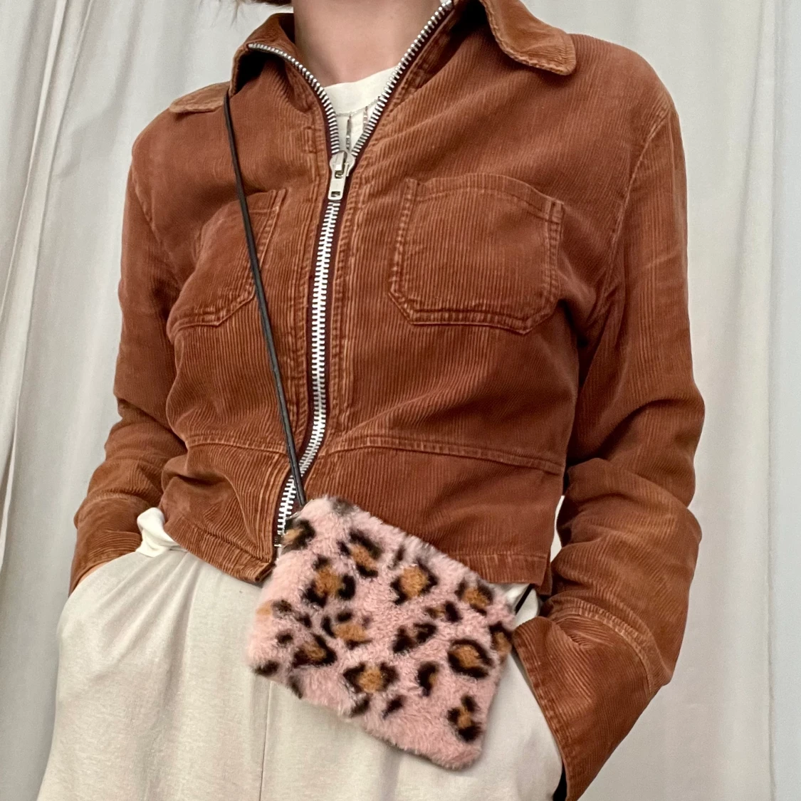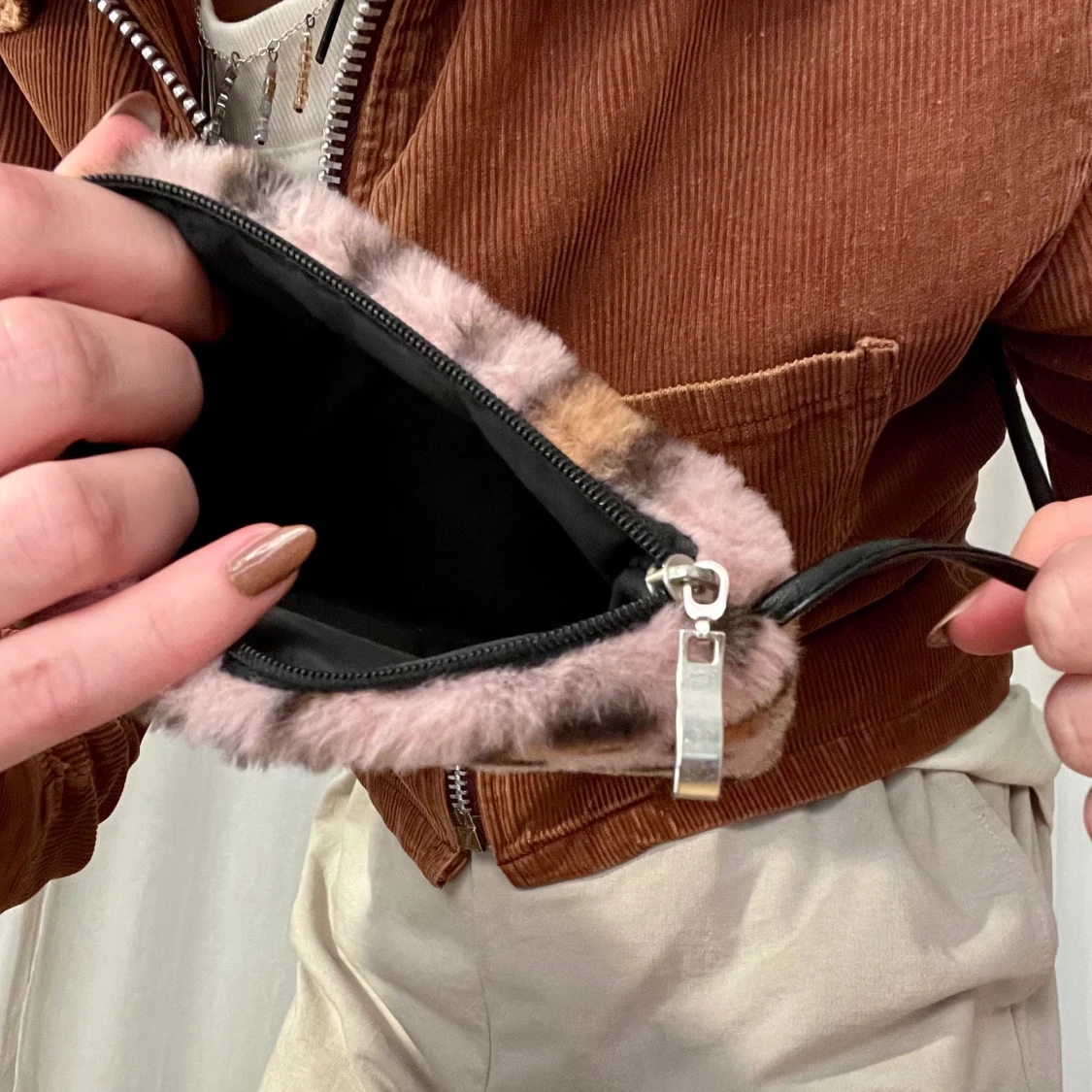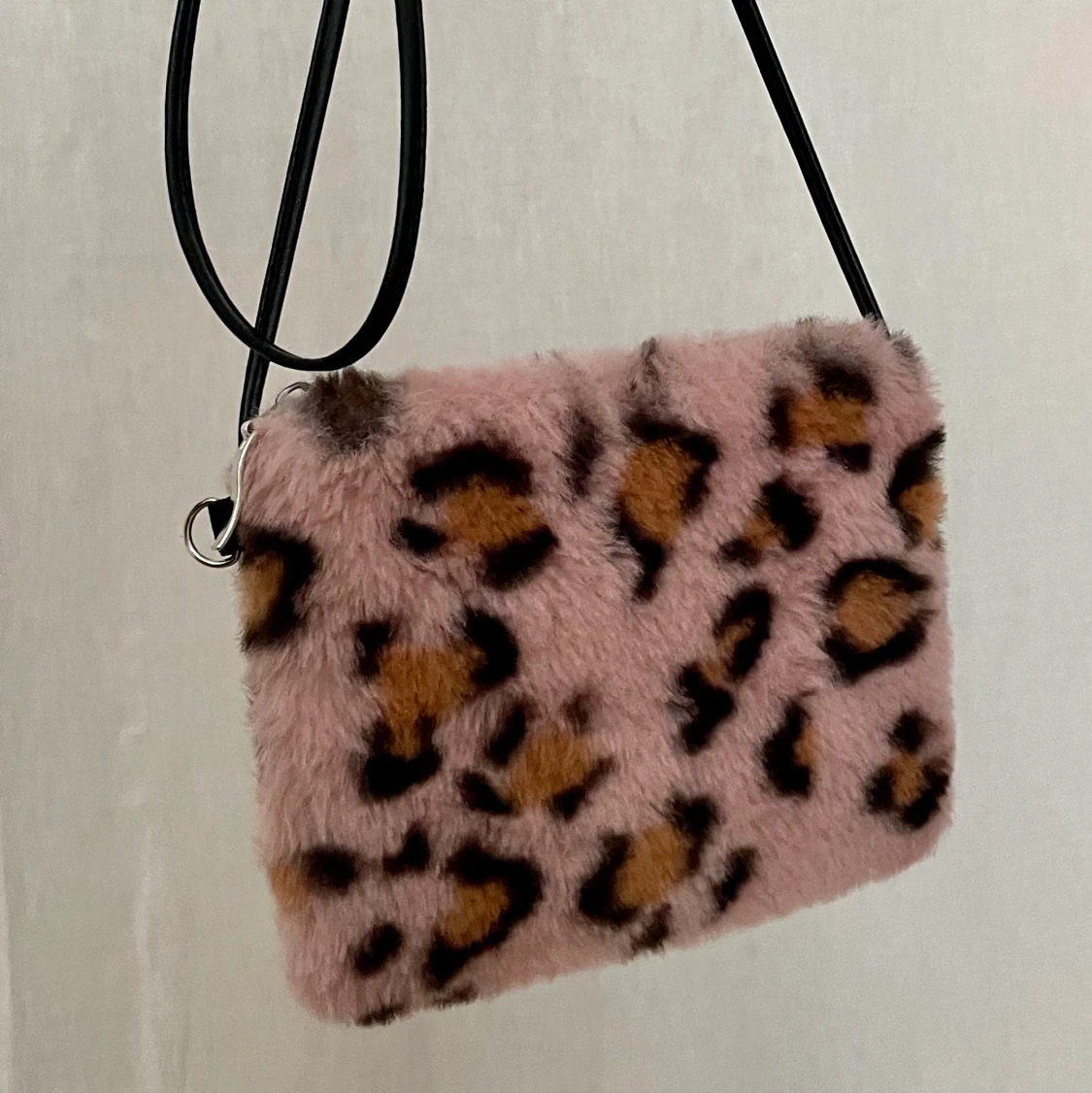 Liten fluffig rosa handväska i leopardmönstrad fuskpäls. Köpt i Tokyo och har inget märke. Aldrig använd och är i gott skick.