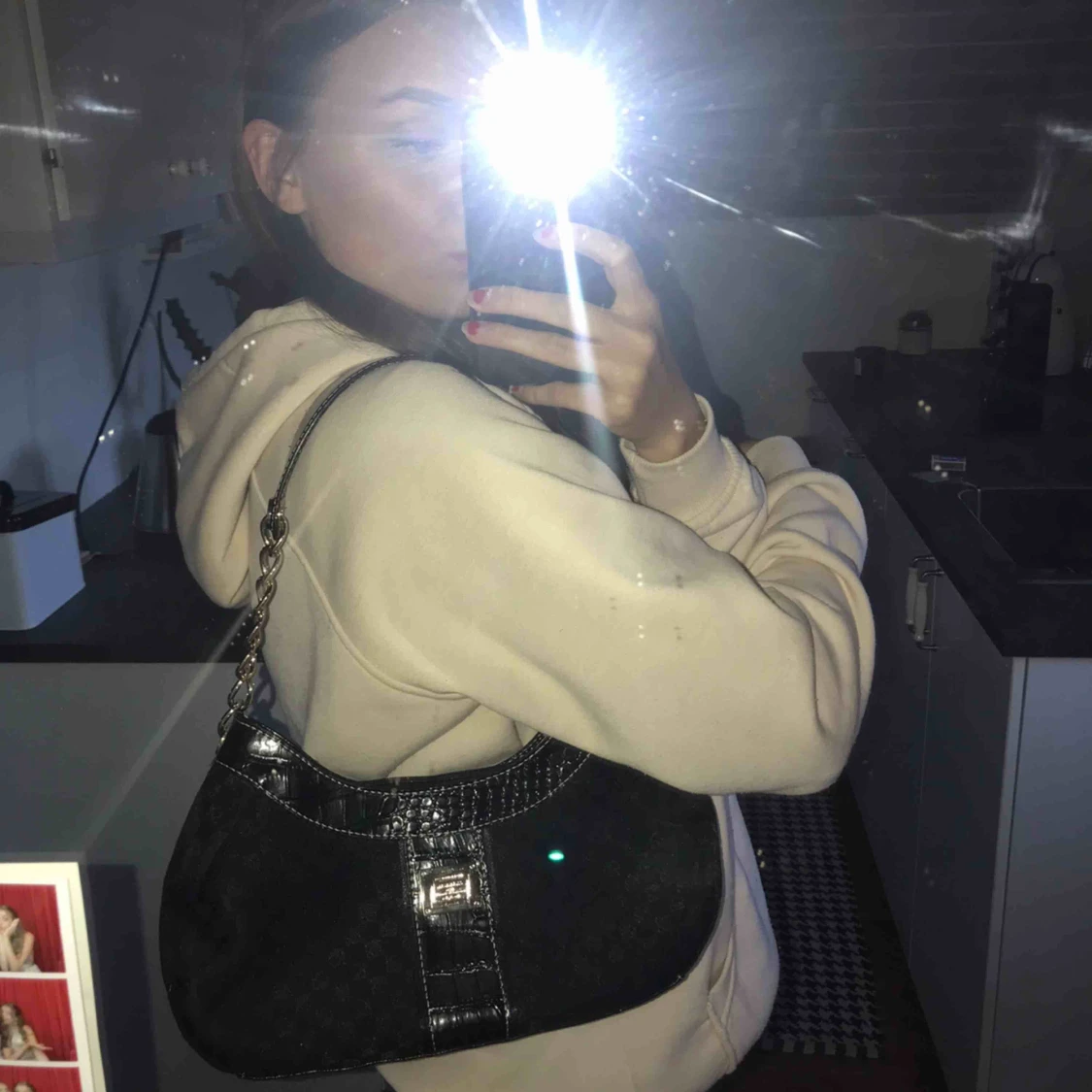 Supersnygg svart/ mönstrad väska med gulddetaljer. Väskan stängs med en dragkedja och det finns ett invändigt fack som även det stängs med dragkedja.