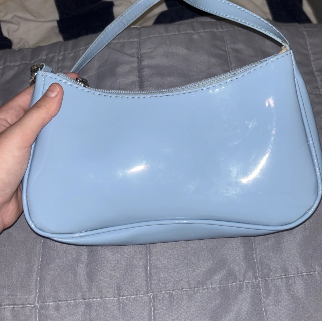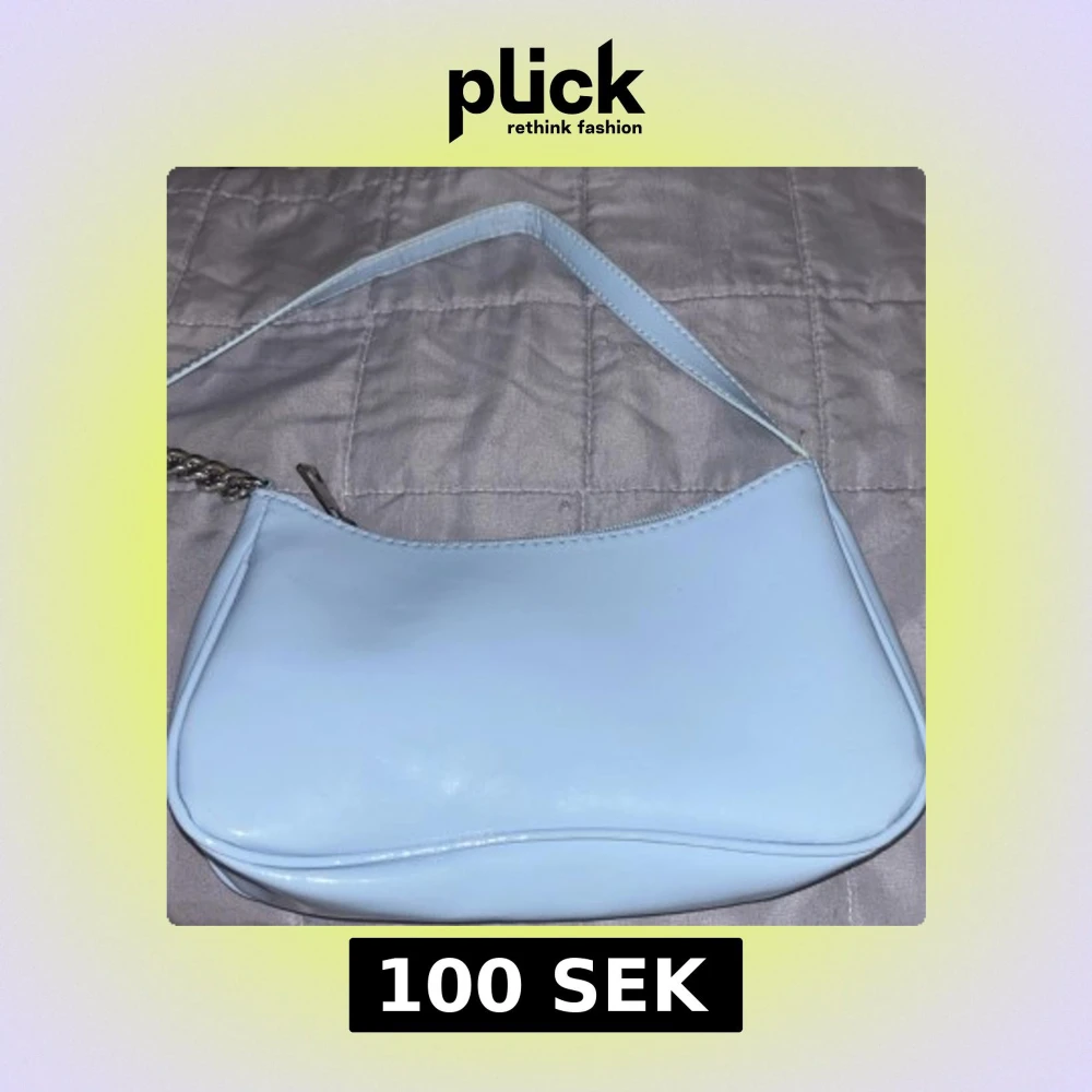 Snygg ljusblå axelväska i syntetmaterial med en stilren design. Väskan har en dragkedja upptill och en kedjedetalj på axelremmen som ger en extra touch. Perfekt för att bära dina nödvändigheter med stil.