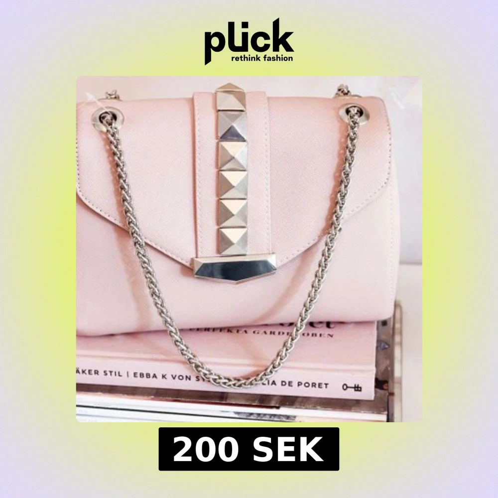 Snygg ljusrosa axelväska med silverfärgad kedjerem och nitar framtill. Väskan har flera fack inuti för bra organisering och stängs med metallspänne.