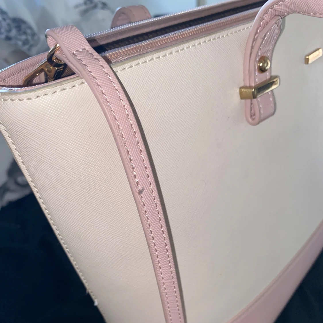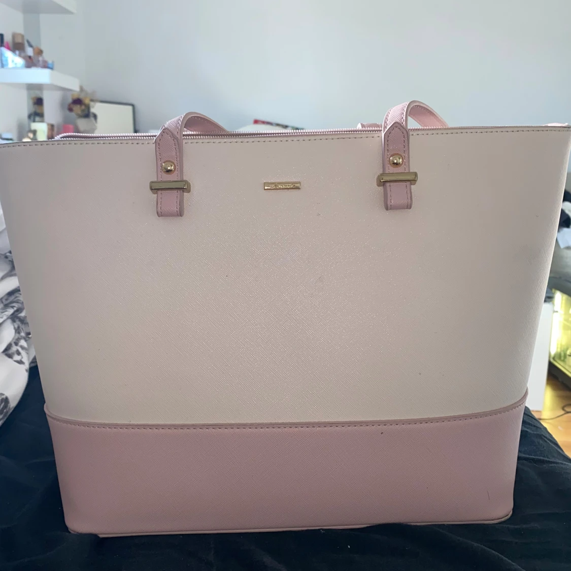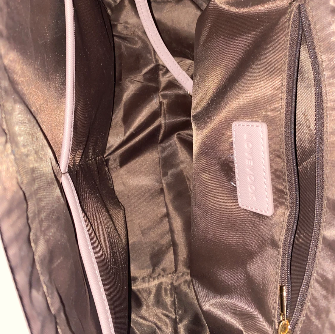 Snygg axelväska från Lovevook i ljusrosa och beige med guldiga detaljer. Väskan har stilren design, dragkedja upptill och flera fack inuti för smart organisering. Perfekt storlek för att få plats med allt du behöver och matchar lätt till olika outfits.