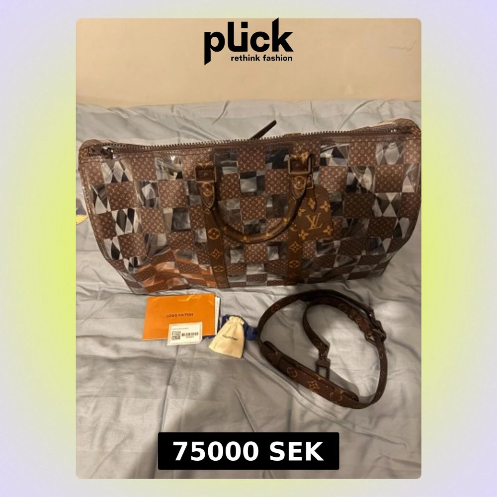 Unik Louis Vuitton Keepall 50 Chess resväska med schackrutigt mönster i brunt och transparent. Väskan har klassiska LV-monogramdetaljer, robusta handtag och justerbar axelrem. Materialet är en mix av skinn och transparent syntet, med dragkedja och LV-tag.