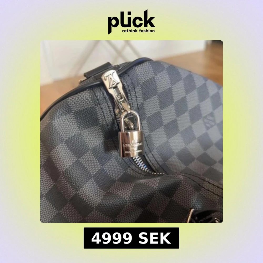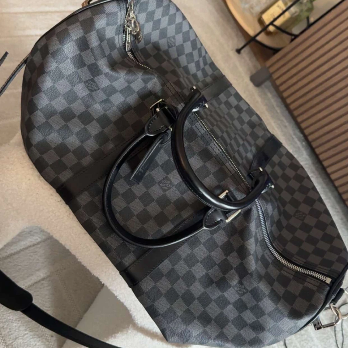 Snygg duffle bag från Louis Vuitton i klassiskt Damier Graphite-mönster. Väskan är svart och grå med rutigt mönster, har silverfärgade detaljer, dubbla handtag och axelrem. Tillverkad i slitstarkt skinn och har dragkedja med lås.