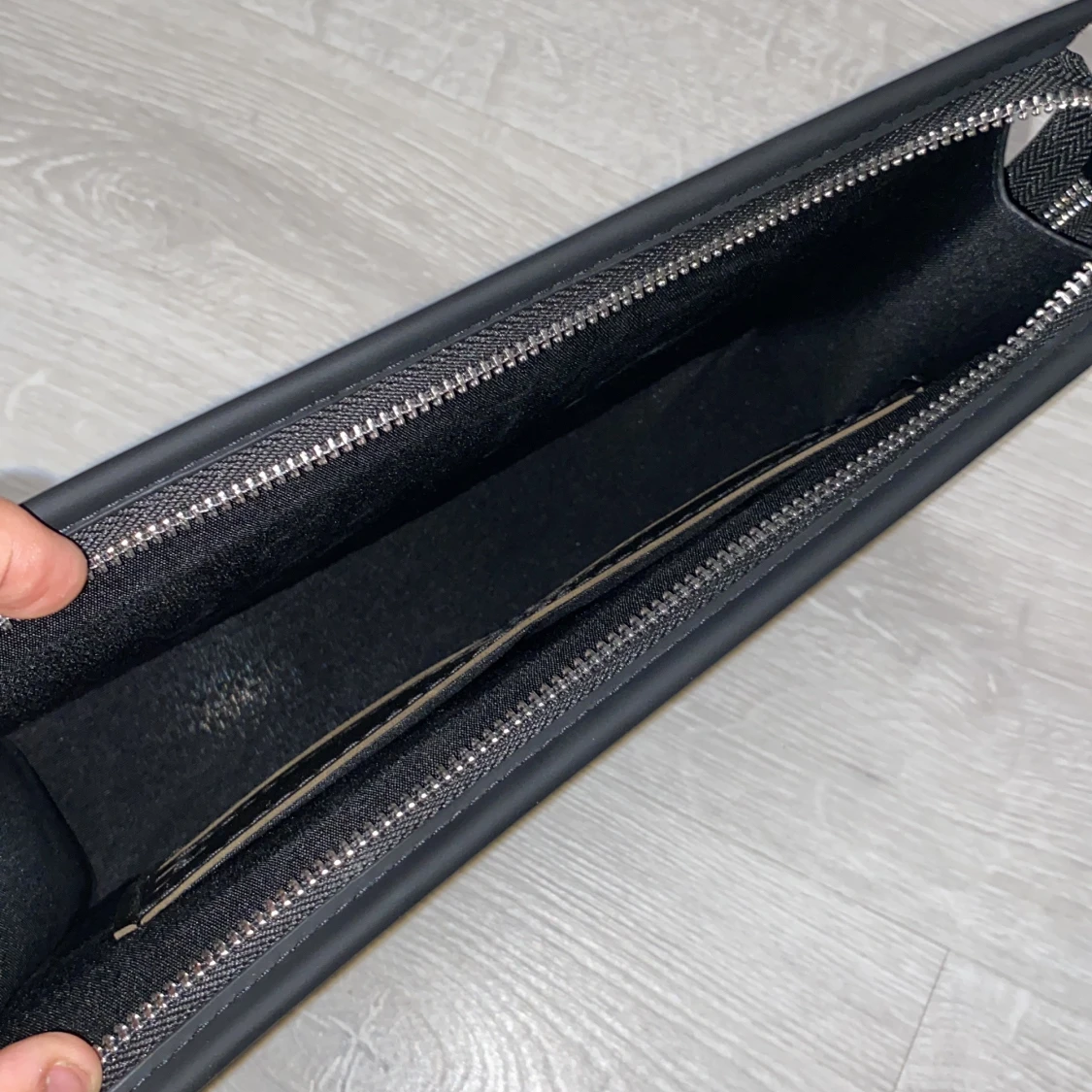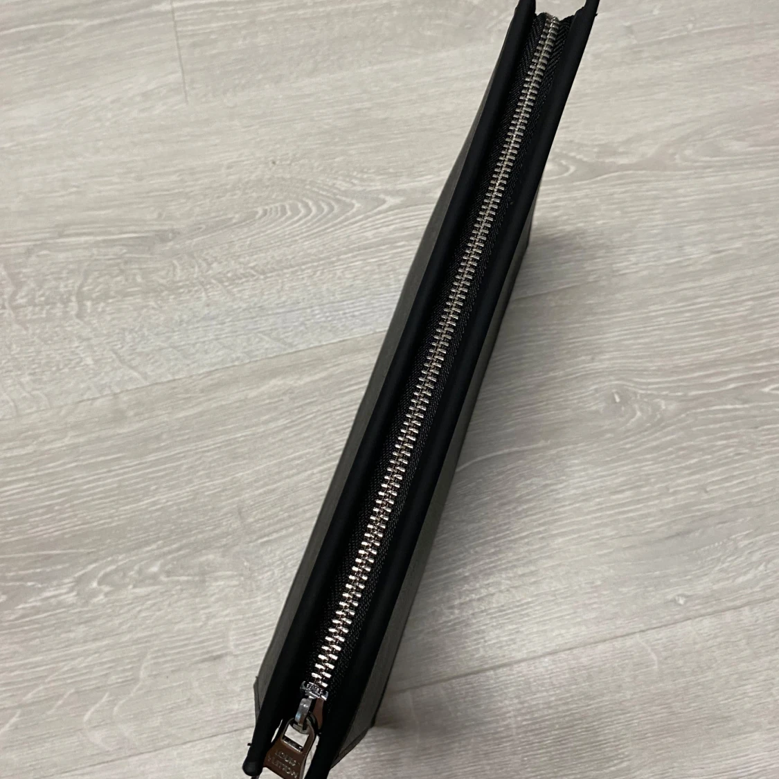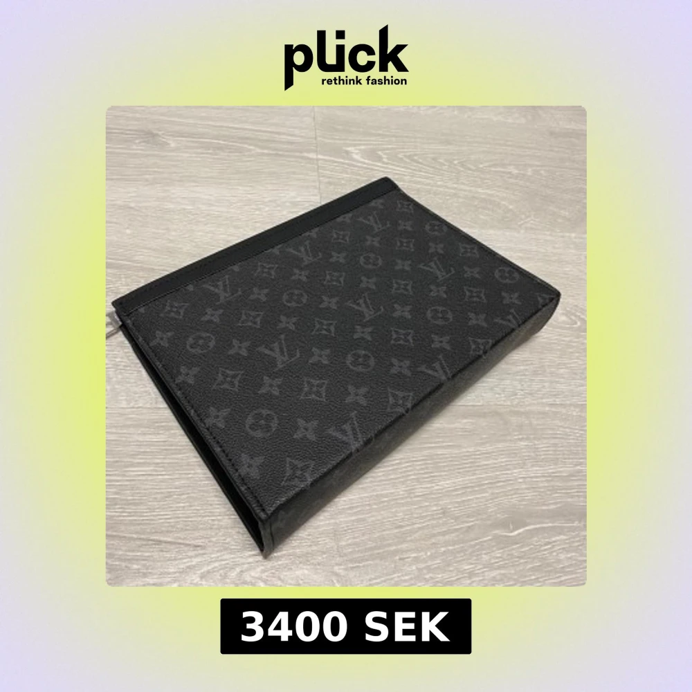 Snygg svart kuvertväska med klassiskt monogrammönster. Väskan är tillverkad i skinn och har en silverfärgad dragkedja upptill. Perfekt för att bära det viktigaste och ger en lyxig touch till din outfit.