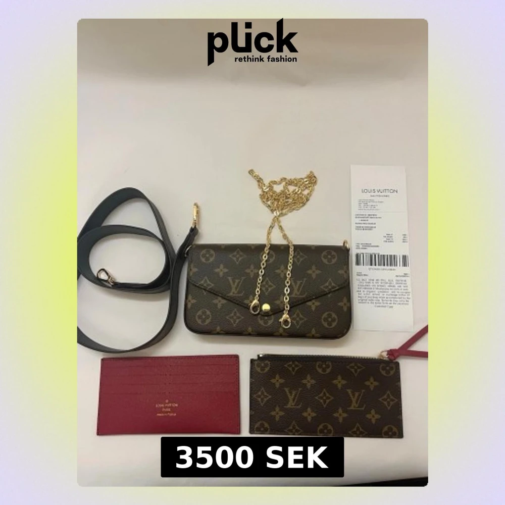 Säljer en ikonisk Louis Vuitton axelväska i klassiskt monogrammönster. Väskan har guldfärgad kedja, avtagbar svart axelrem och matchande monogram-plånbok samt röd kortficka. Materialet är exklusivt skinn med LV-logga och detaljer i guld.