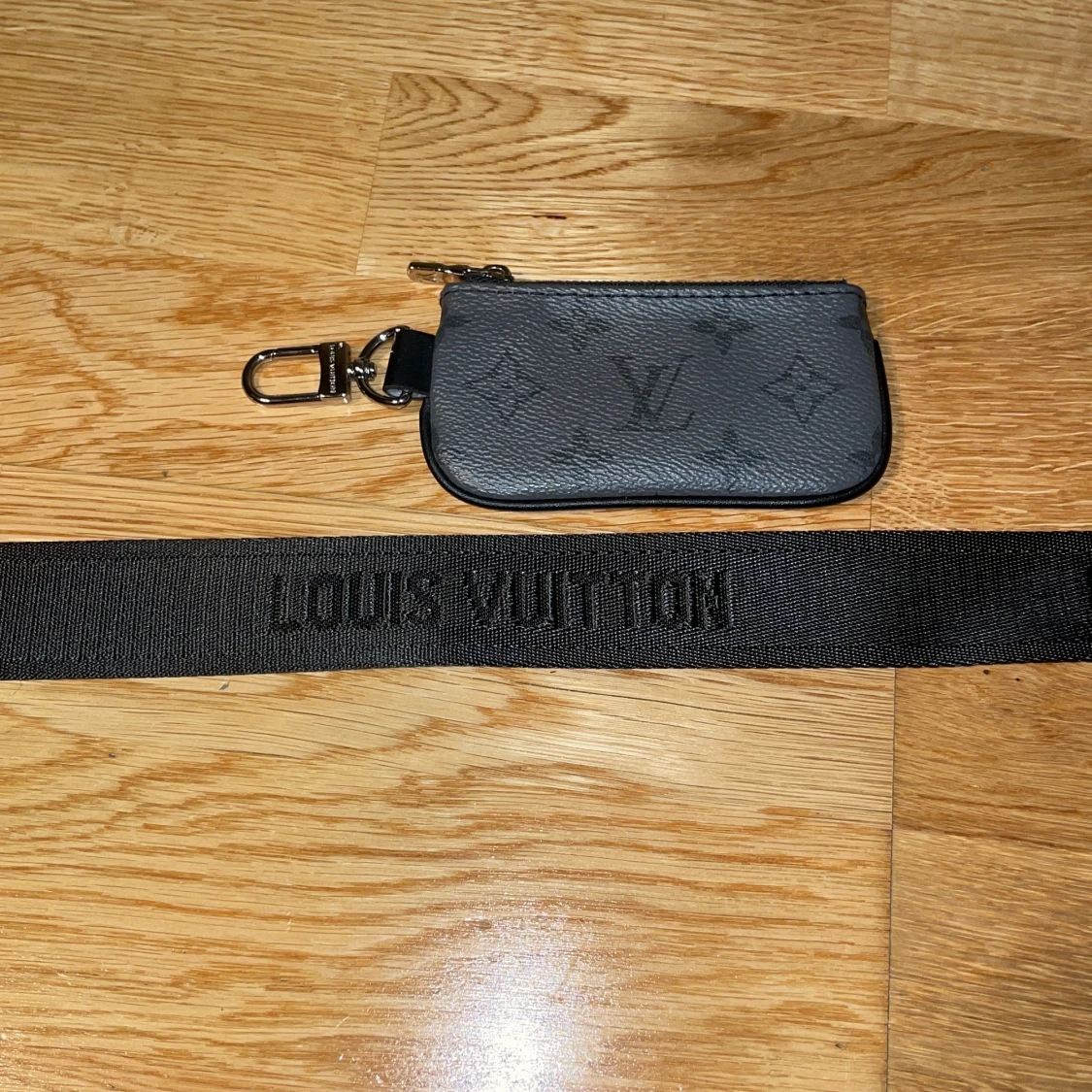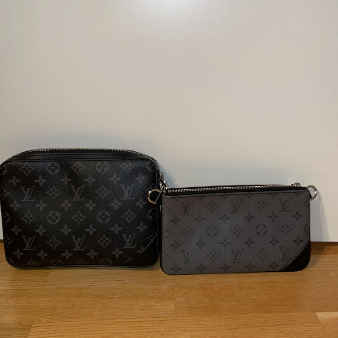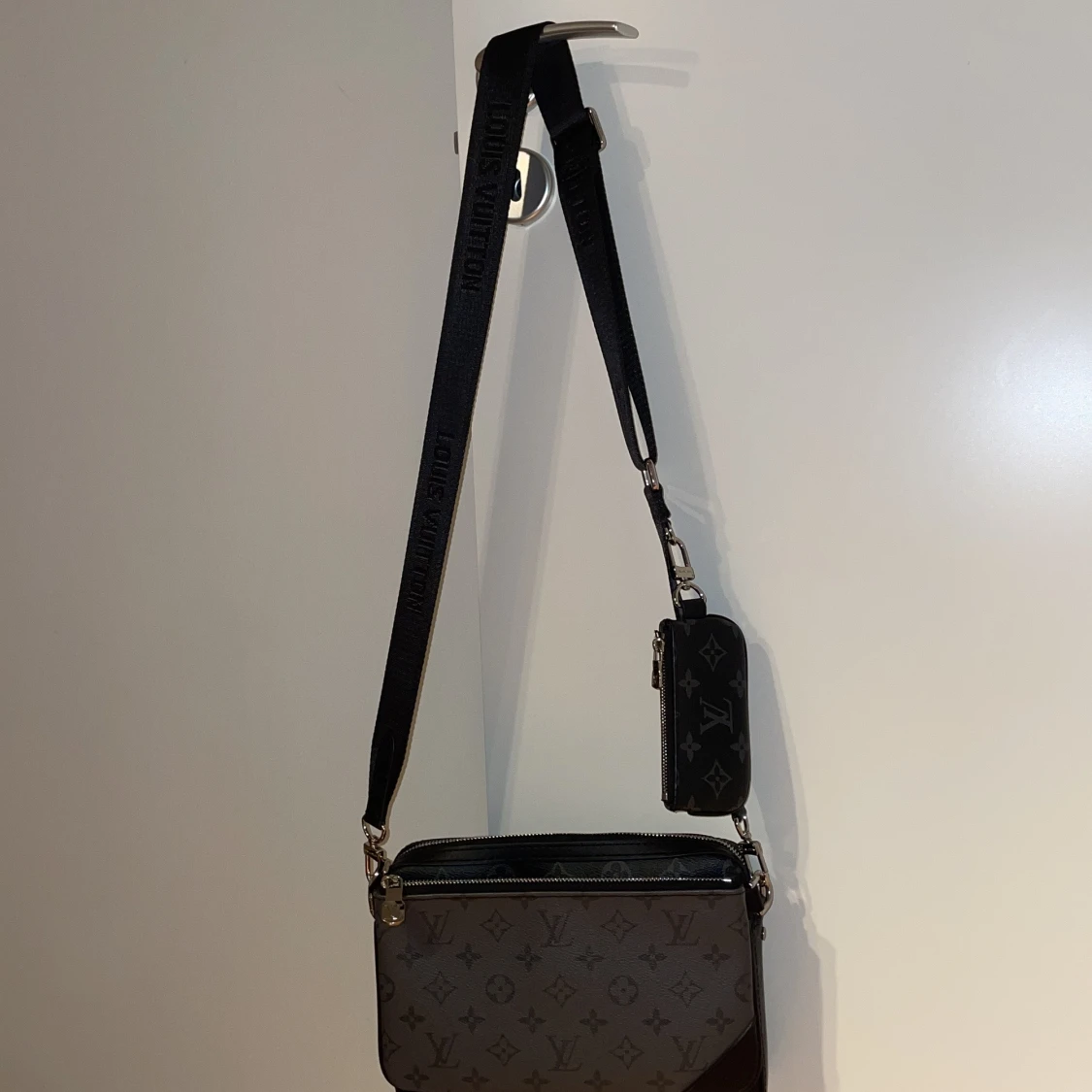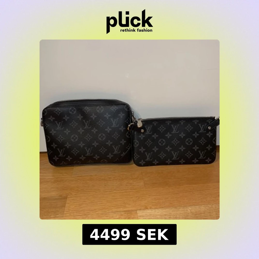 Säljer en svart axelväska från Louis Vuitton med klassiskt monogrammönster i grått. Väskan har flera delar, inklusive en mindre pouch och en liten plånbok, alla med dragkedja. Justerbar axelrem med Louis Vuitton-tryck. Perfekt för dig som gillar stilren och lyxig design. PRIS KAN DISKUTERAS VID SNABB AFFÄR!