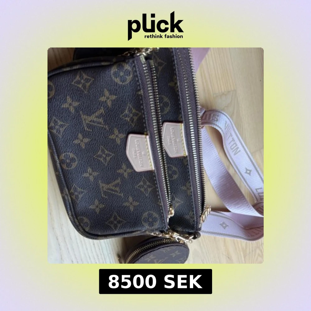 Säljer en brun axelväska från Louis Vuitton med klassiskt monogrammönster och guldiga detaljer. Väskan har flera fack med dragkedja och en bred, ljusrosa axelrem med logga. Materialet är skinn och syntet, perfekt för dig som vill ha en ikonisk och trendig accessoar.