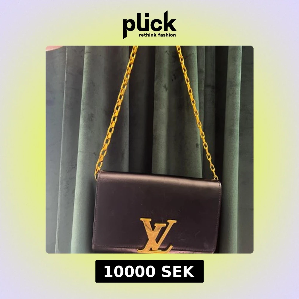 Säljer en svart axelväska från Louis Vuitton med ikoniskt LV-spänne i guld och en snygg kedjerem i metall. Väskan är tillverkad i slätt skinn och har en stilren, rektangulär form. Perfekt för dig som vill ha en lyxig och tidlös accessoar.