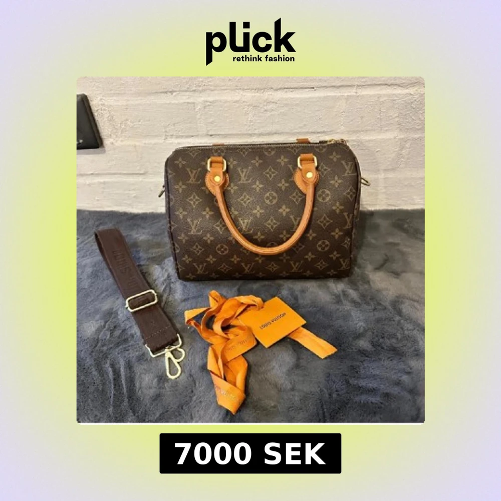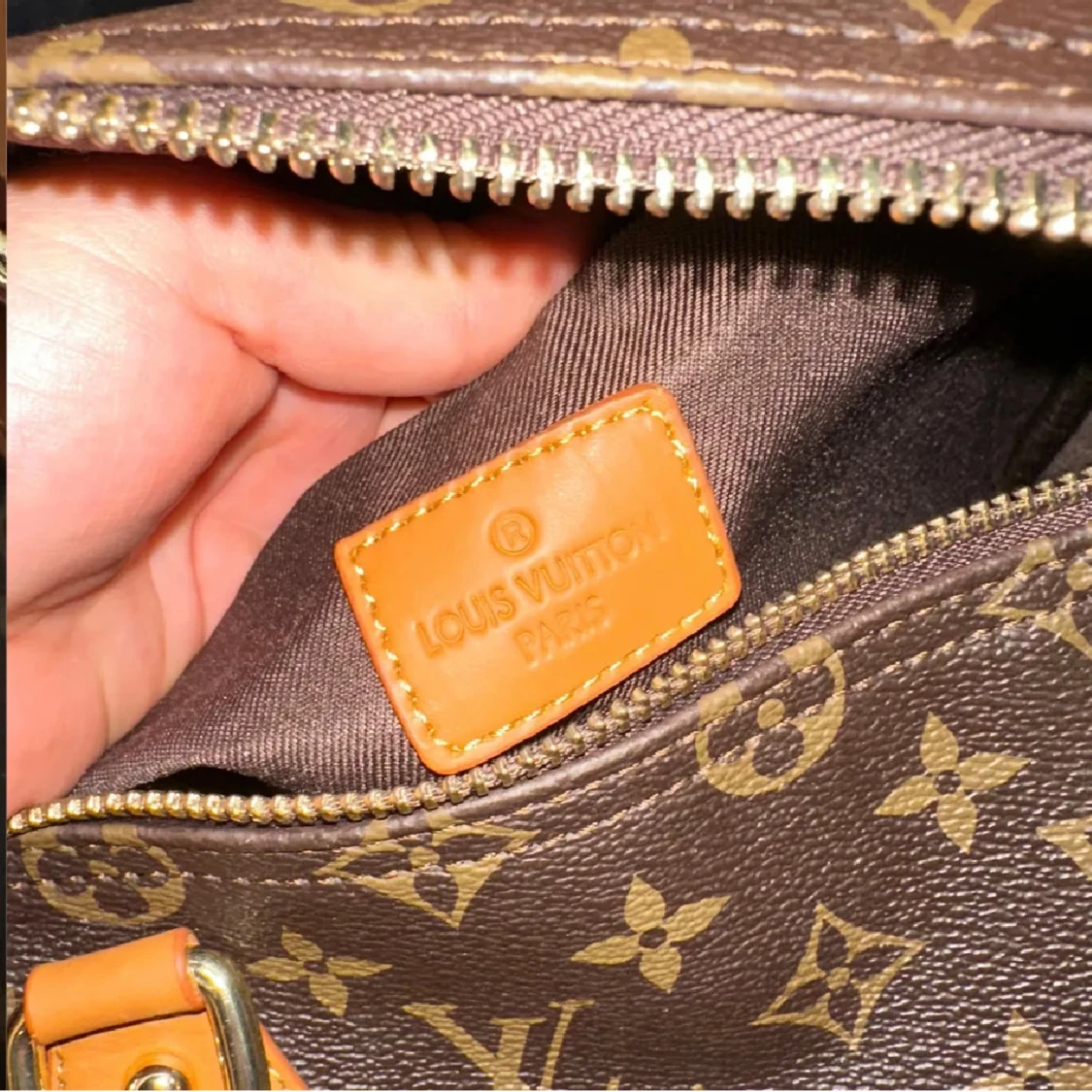 Snygg handväska från Louis Vuitton med klassiskt monogrammönster i mörkbrunt och beige. Väskan har guldfärgade detaljer, två handtag i skinn och dragkedja med Louis Vuitton-gravering. Medföljer axelrem och orange band med logga.