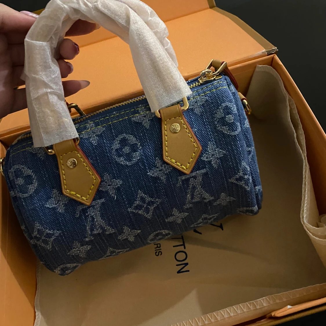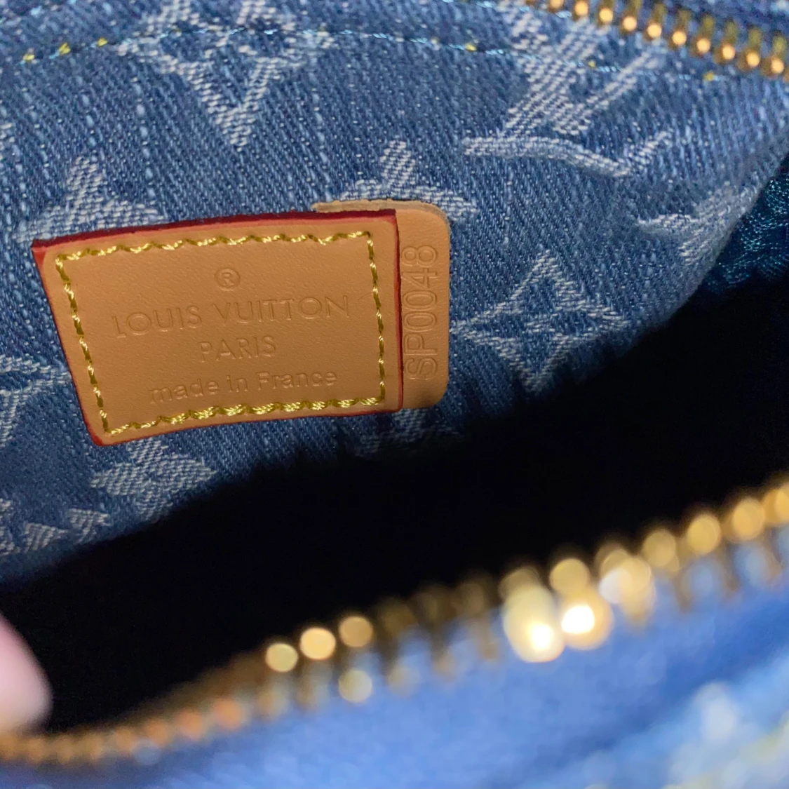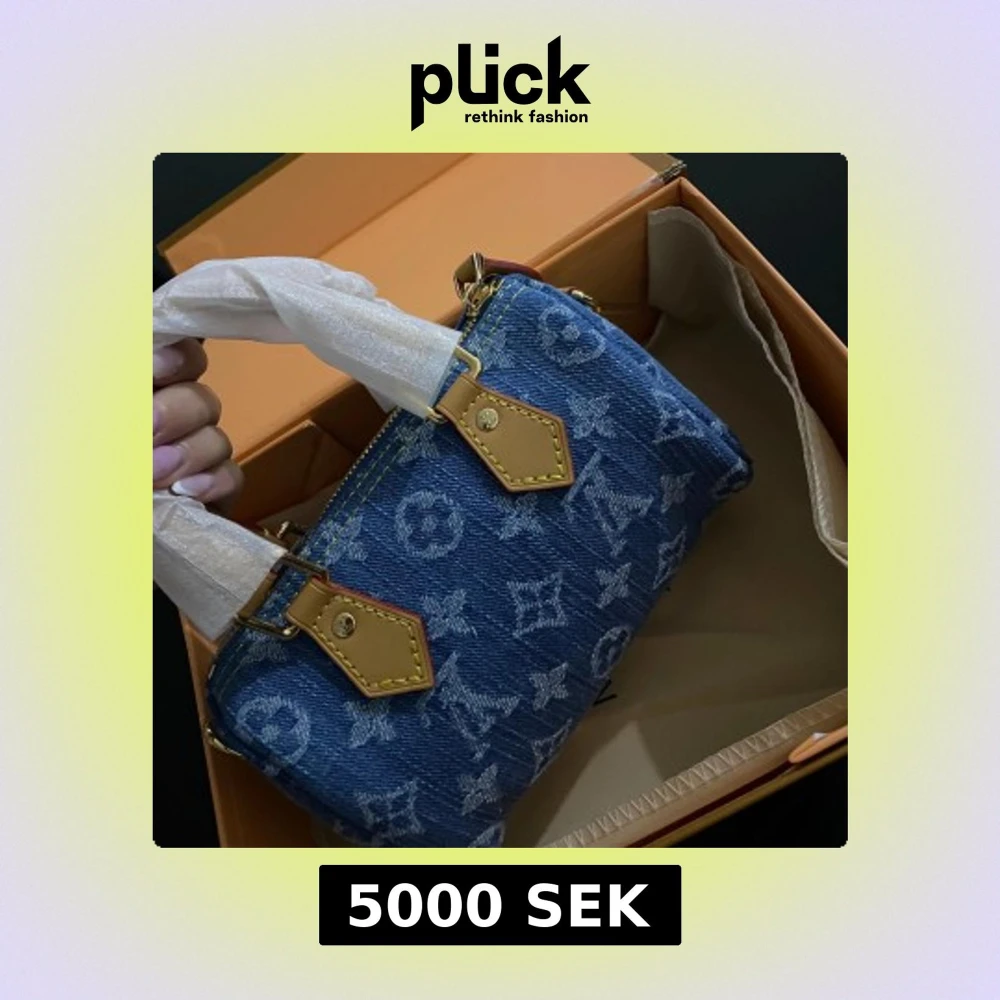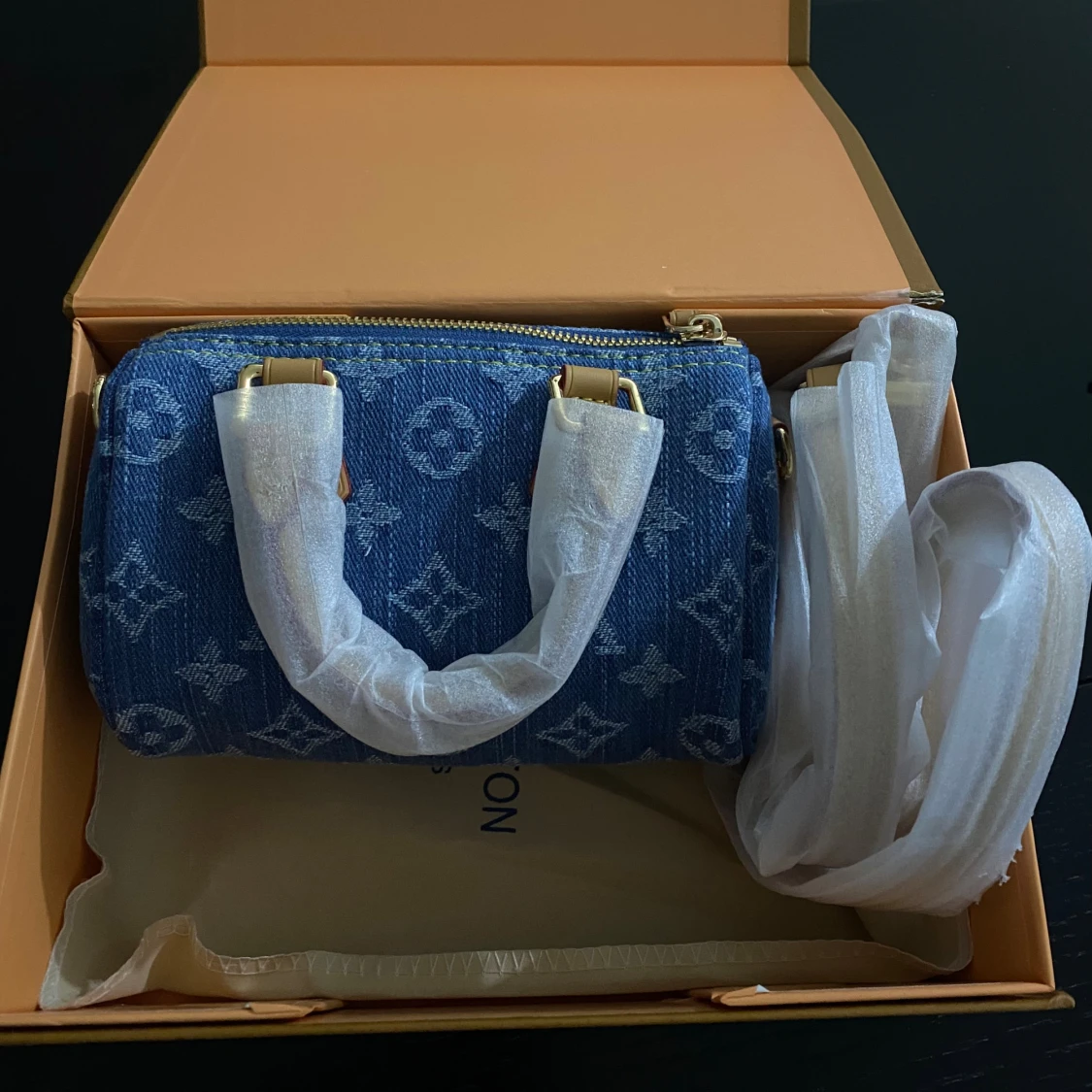Superfin handväska från Louis Vuitton i blått denimtyg med ikoniskt monogrammönster. Väskan har detaljer i ljust skinn, guldfärgade metalldelar och dragkedja upptill. Kommer med både handtag och axelrem för olika stilar. Perfekt för dig som vill sticka ut med en lyxig touch.