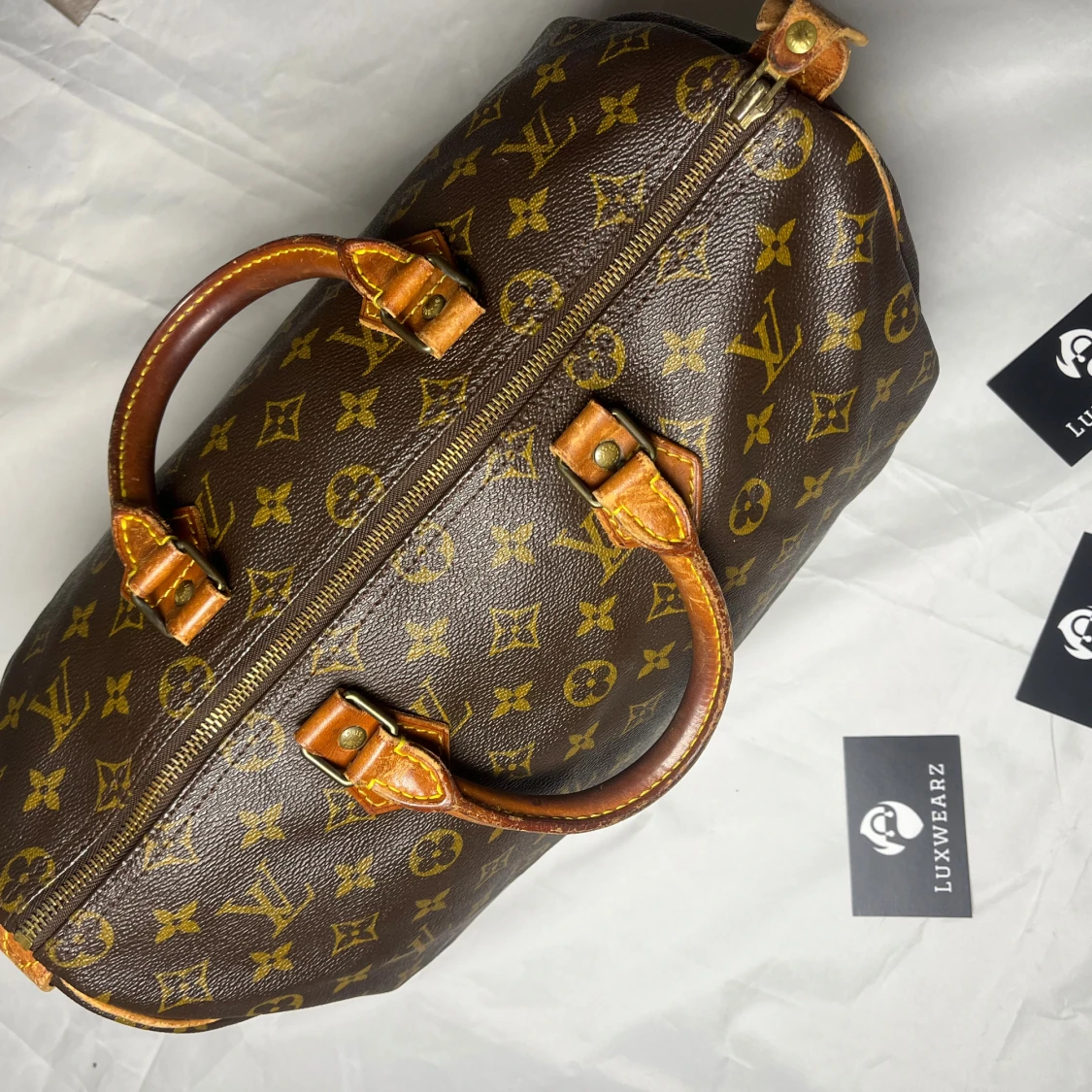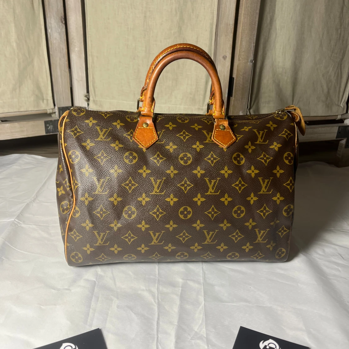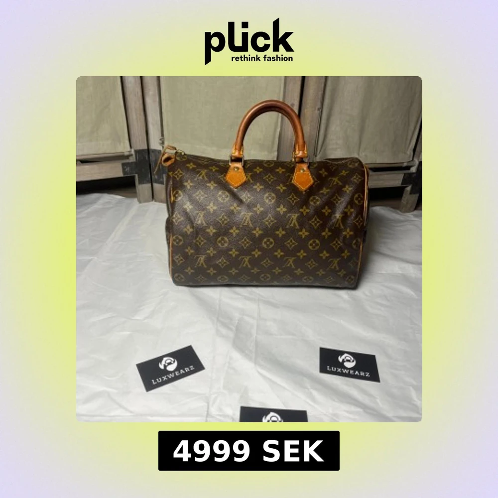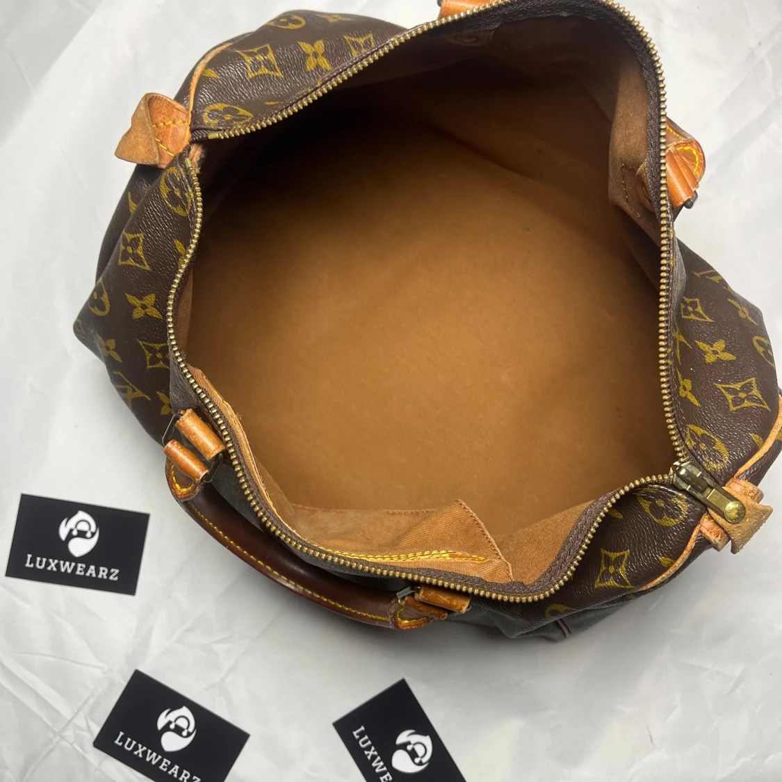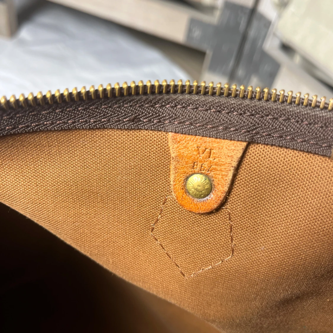 Klassisk handväska från Louis Vuitton i brunt skinn med ikoniskt monogrammönster i gult. Väskan har rund form, två robusta handtag och dragkedja upptill. Perfekt för dig som vill ha en tidlös och lyxig accessoar med plats för det viktigaste.