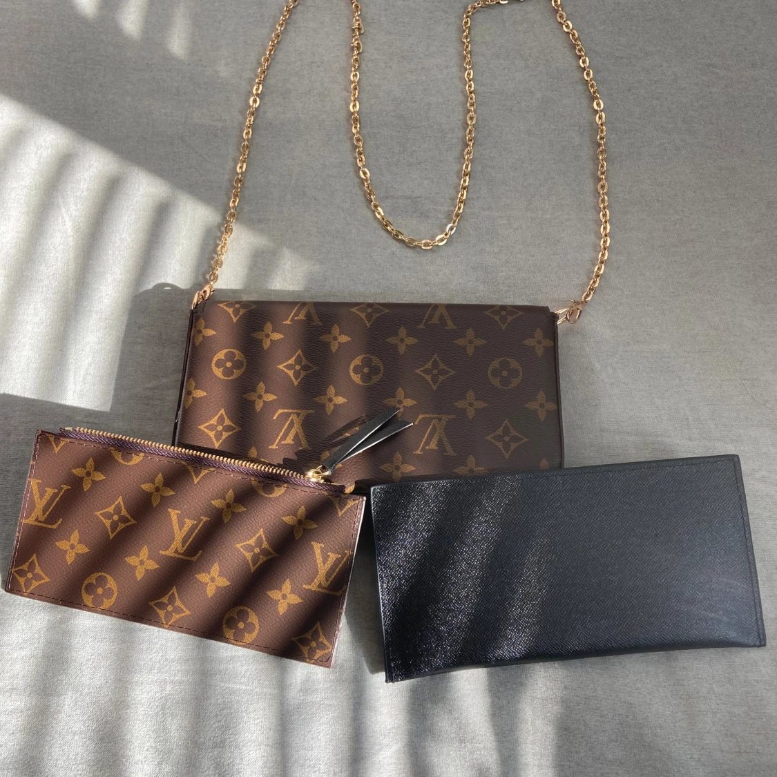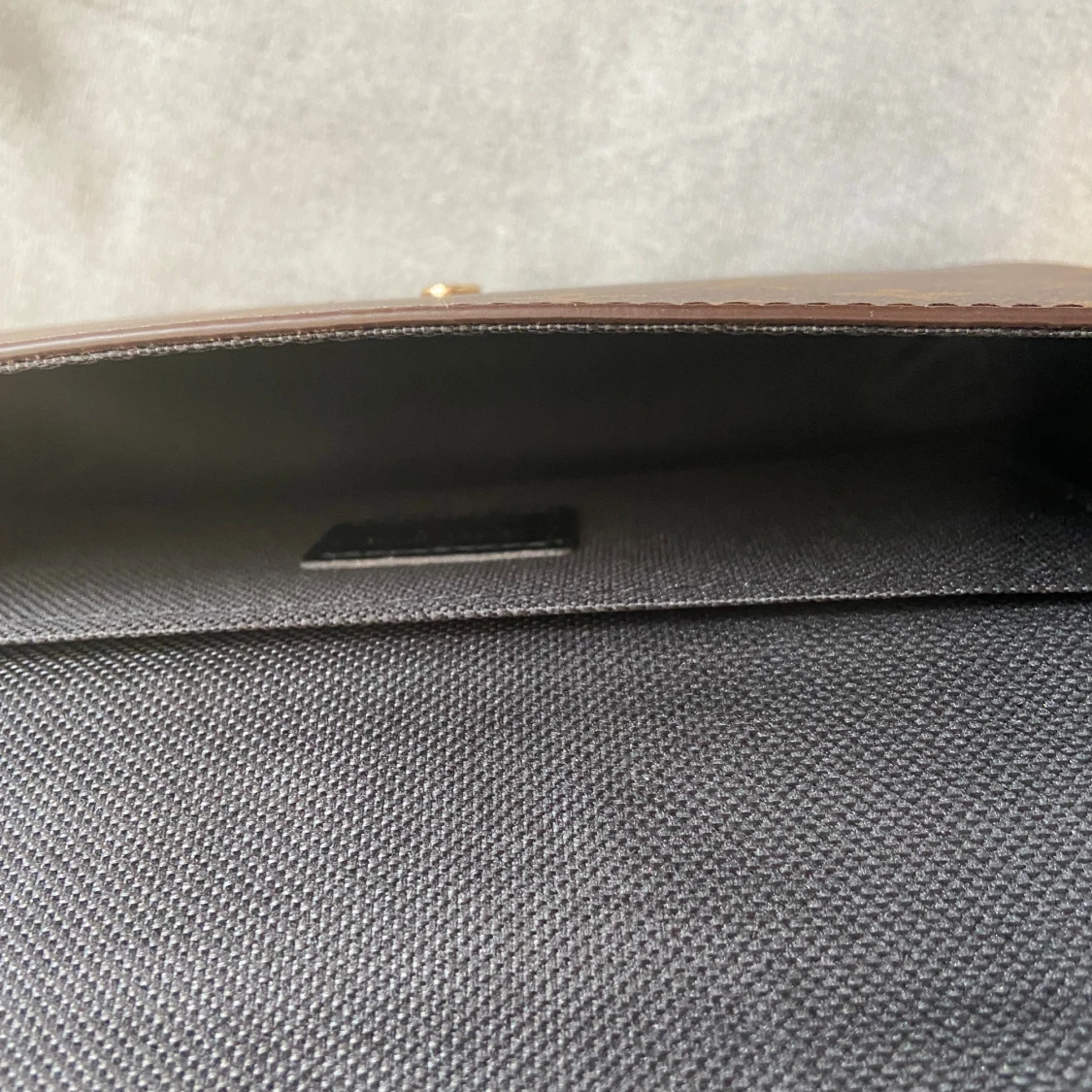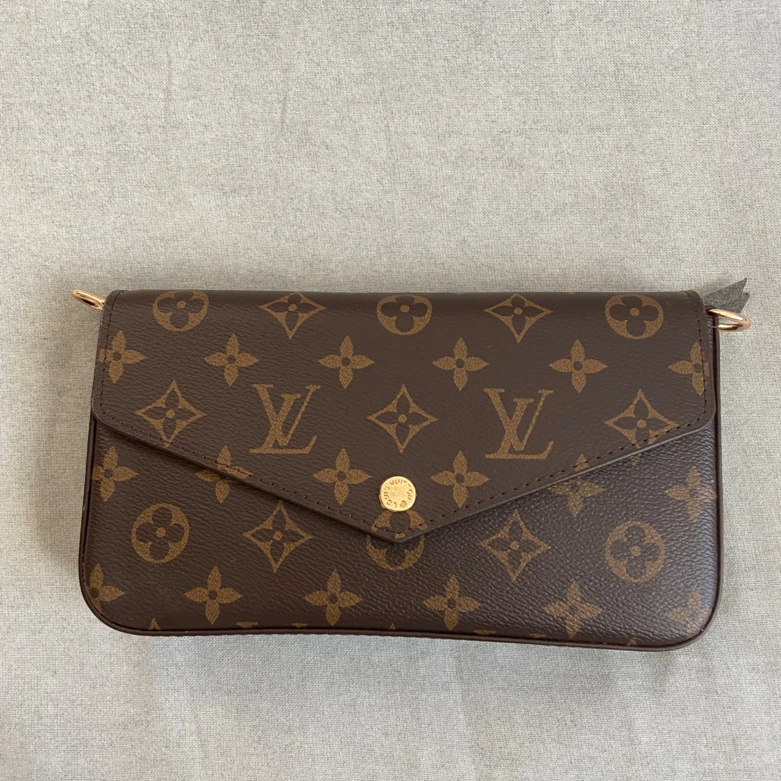 Snygg axelväska från Louis Vuitton i klassiskt monogrammönster. Väskan är brun med guldiga detaljer och kedja, tillverkad i skinn. Kommer med matchande plånbok och innerficka, perfekt för att hålla ordning på dina grejer.