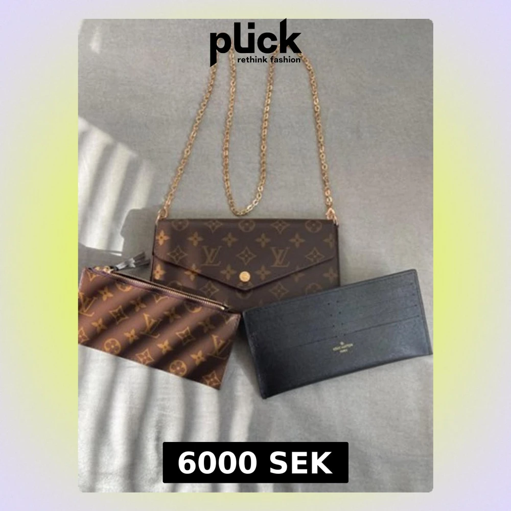 Snygg axelväska från Louis Vuitton med klassiskt monogrammönster i brunt och beige. Väskan har guldfärgad kedja, kuvertformad design och medföljande plånbok och zip-pouch. Tillverkad i skinn med ikoniska LV-detaljer, perfekt för dig som gillar lyxiga accessoarer.