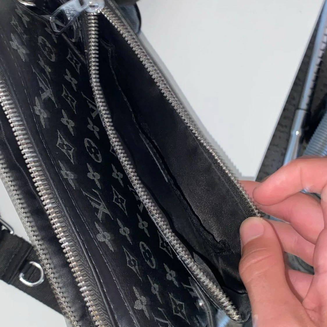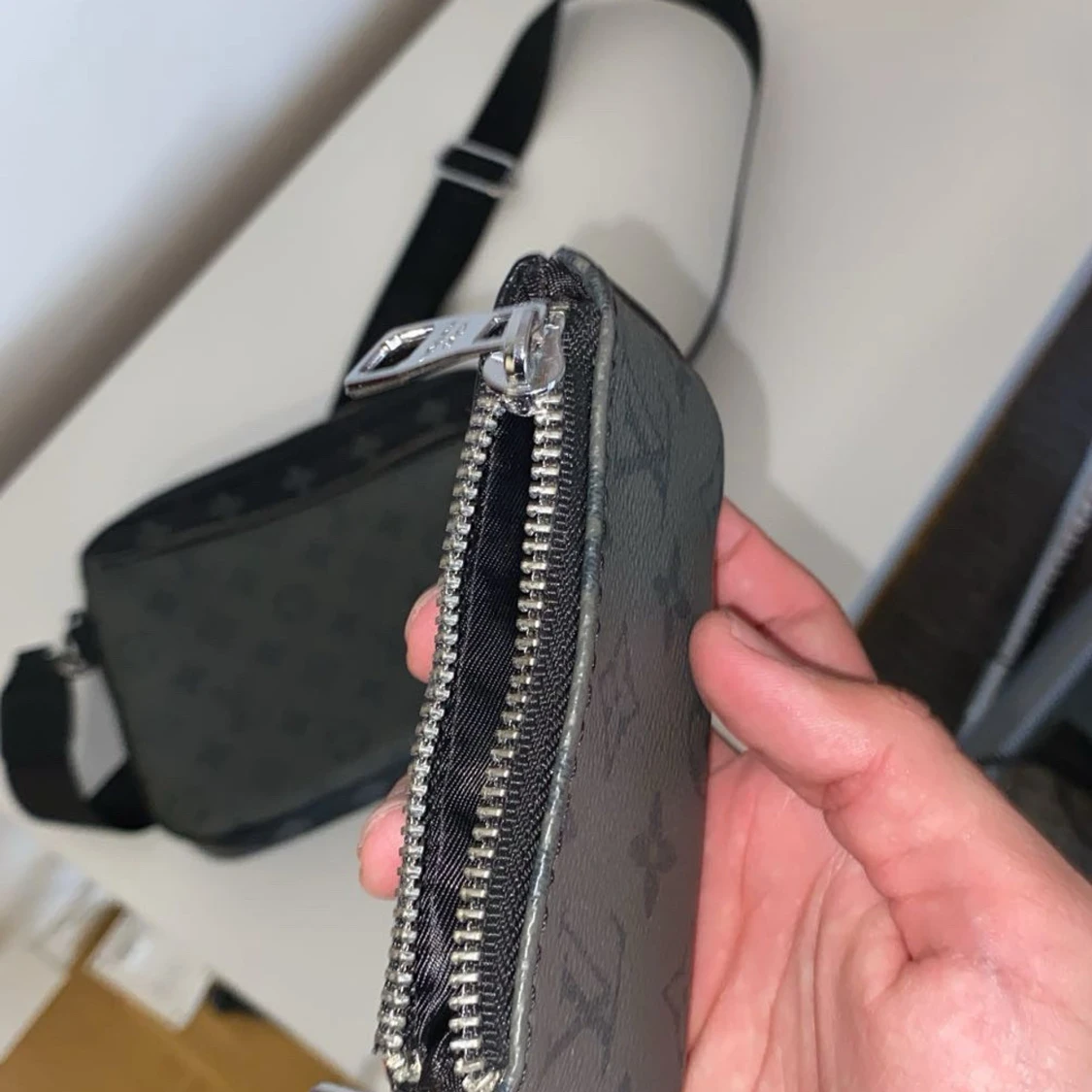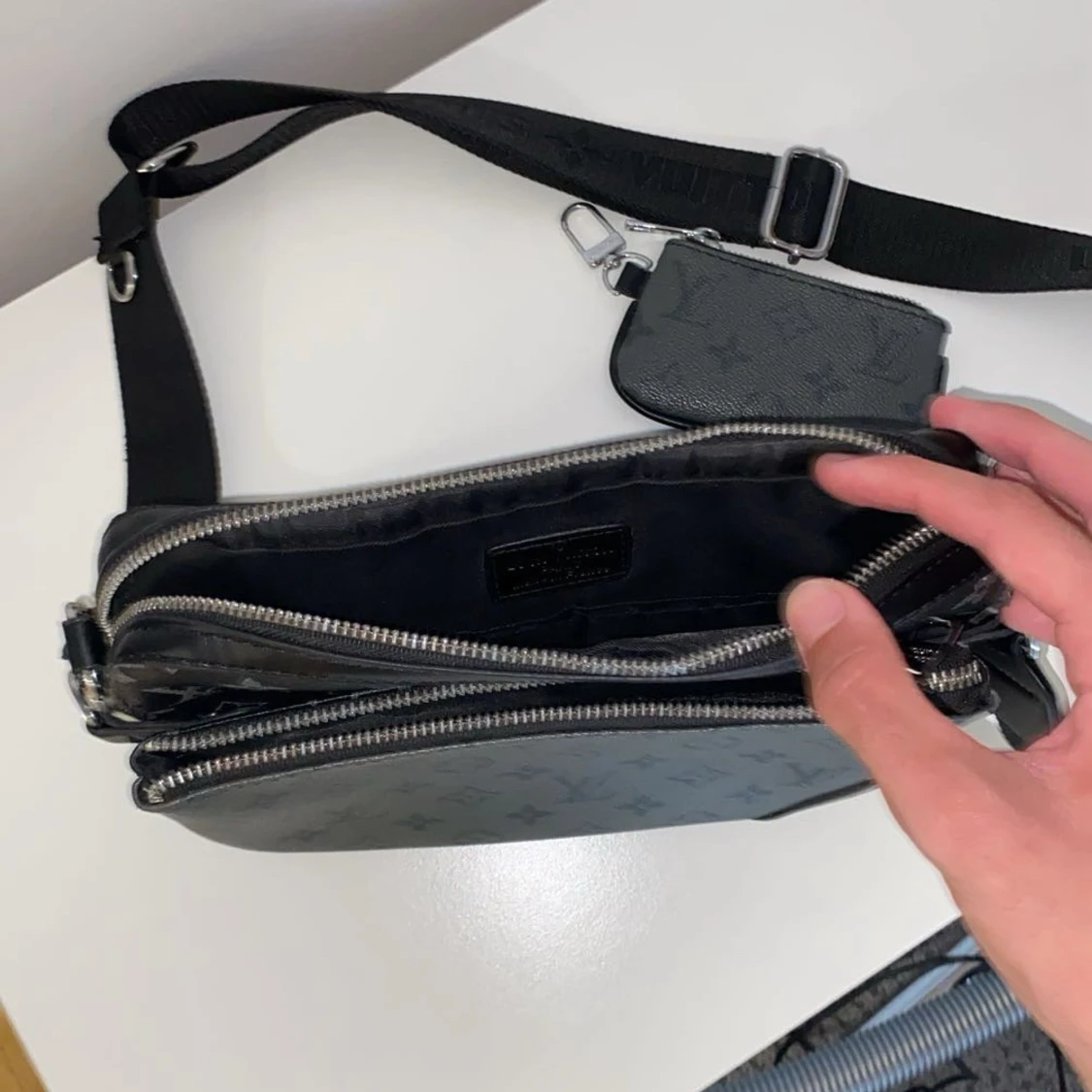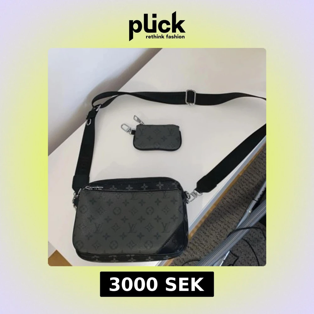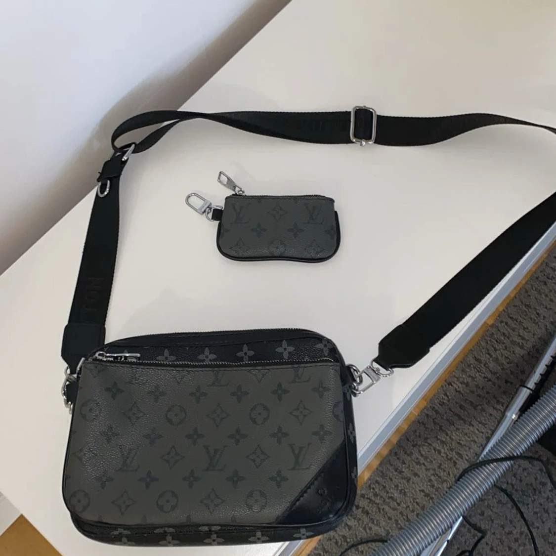 Snygg svart axelväska från Louis Vuitton med klassiskt monogrammönster och matchande liten plånbok. Väskan har justerbar axelrem, dubbla dragkedjor och är tillverkad i skinn. Perfekt för dig som vill ha en stilren och lyxig accessoar.