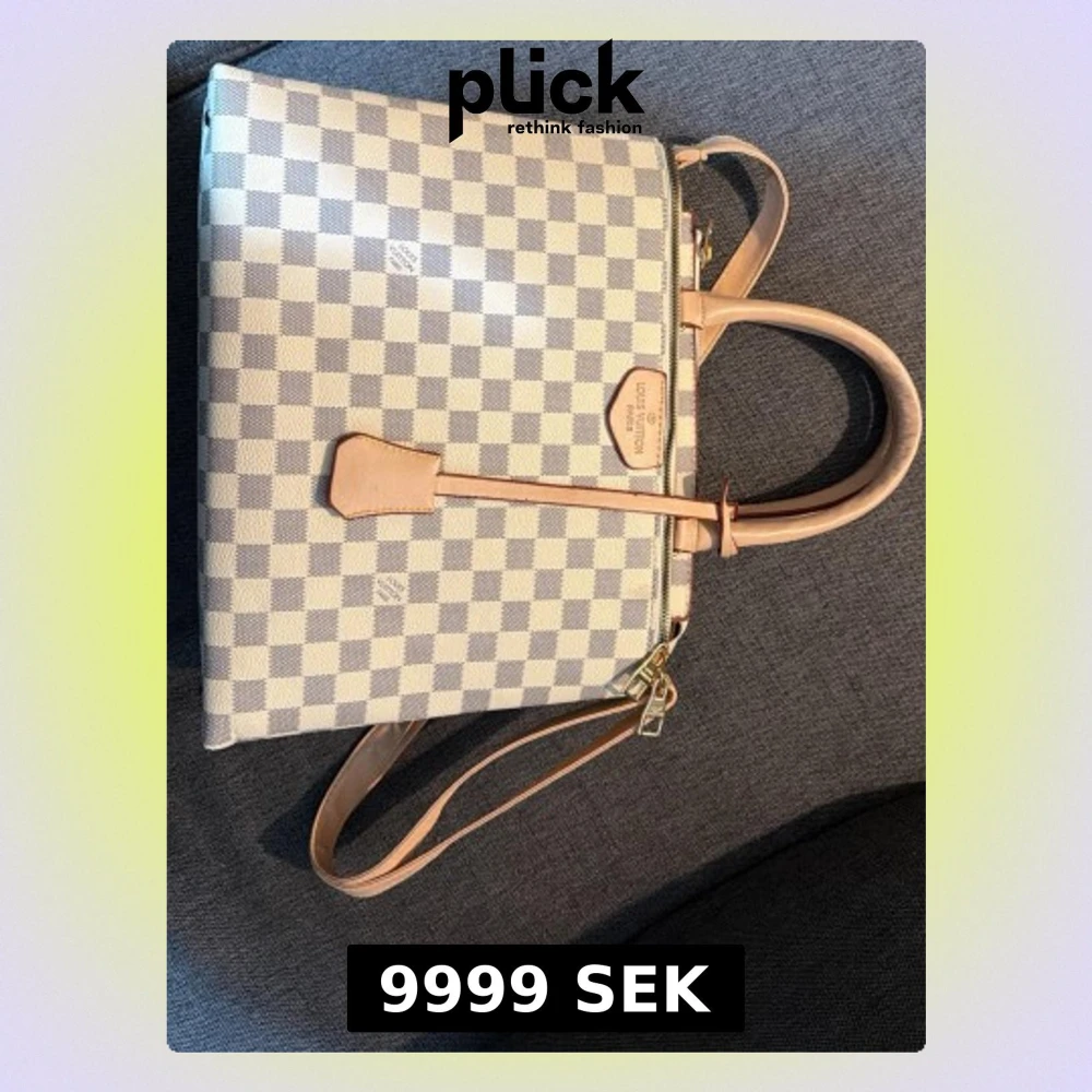 Säljer en snygg rutig handväska från Louis Vuitton i beige och vitt med klassiskt Damier-mönster. Väskan har både handtag och axelrem i ljust skinn samt guldfärgade metalldetaljer och dragkedja. Perfekt för dig som vill ha en ikonisk och stilren accessoar.
