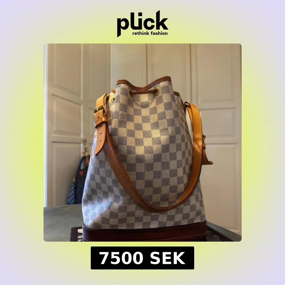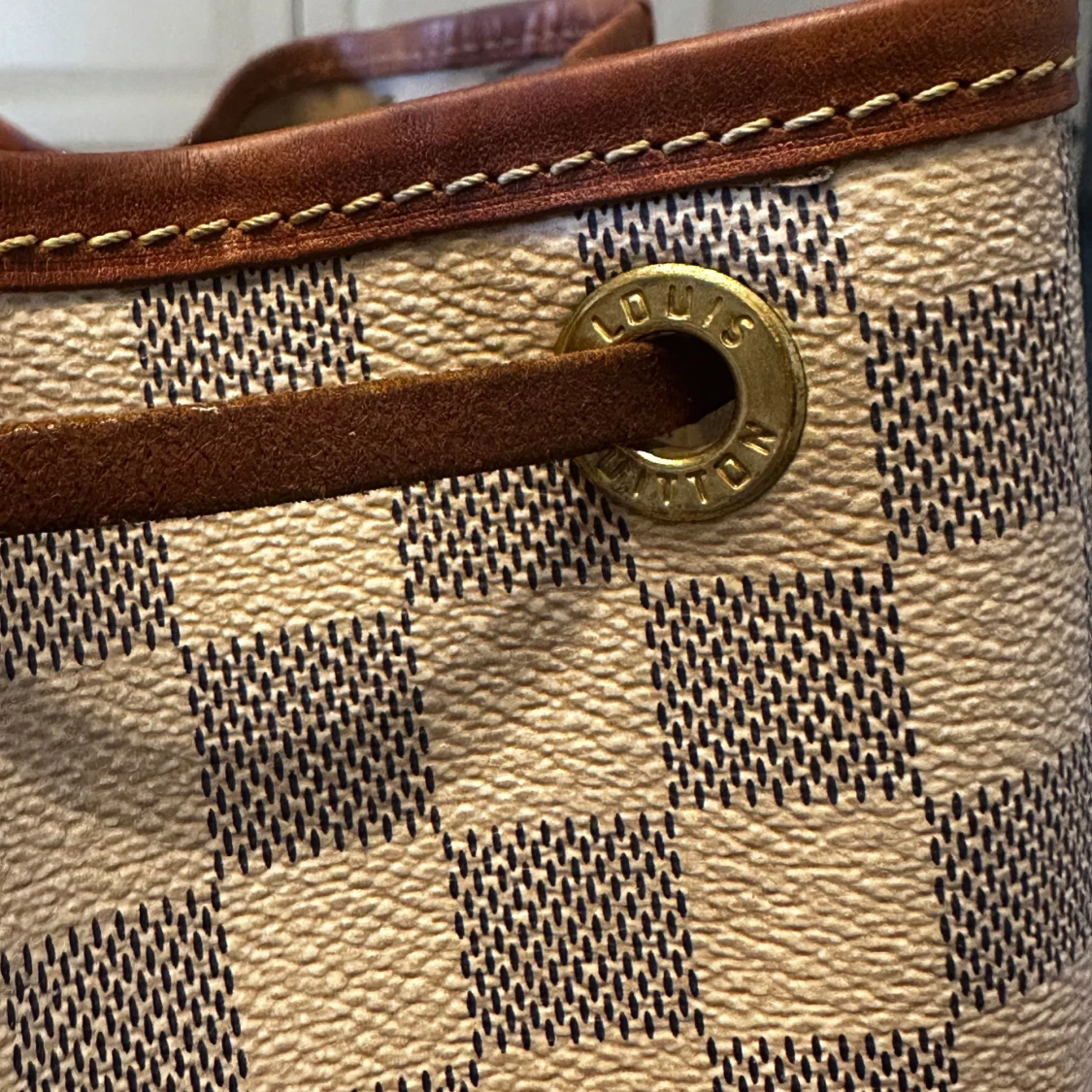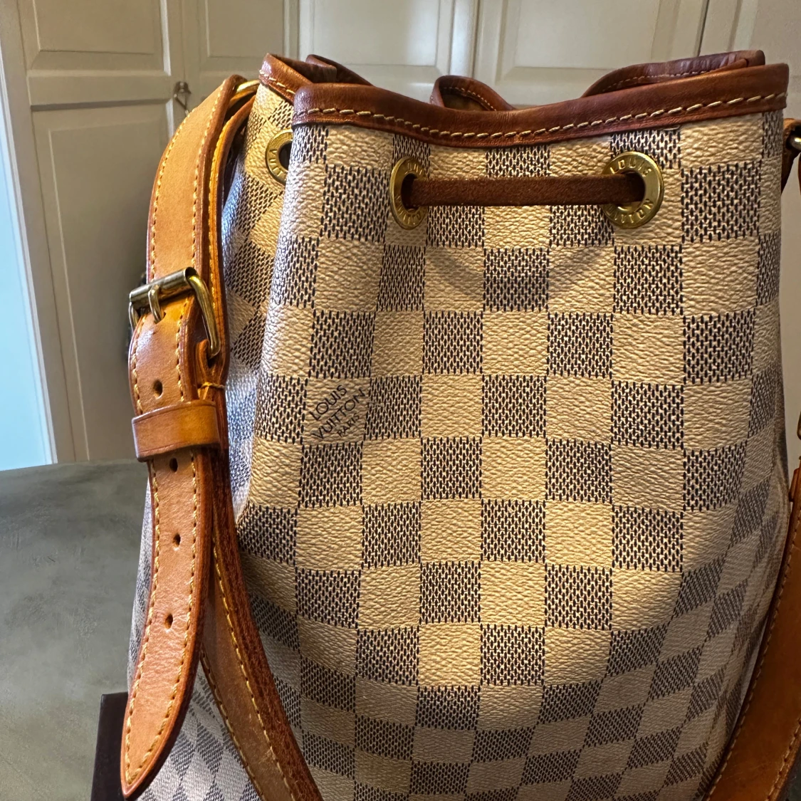 Snygg rutig axelväska modell Noé från Louis Vuitton i beige och grått. Väskan har en justerbar rem i brunt skinn och detaljer i guld. Perfekt för att ge din outfit en lyxig touch. Kvitto finns!