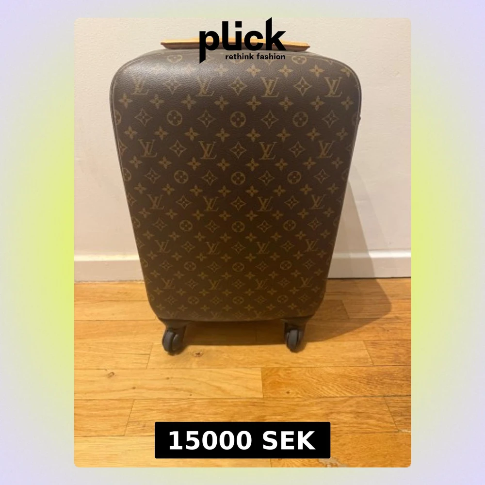 Snygg resväska från Louis Vuitton med klassiskt monogrammönster i brunt och beige. Väskan har fyra hjul, dragkedja och ett handtag i läder. Perfekt storlek för weekendresor och sticker ut med sin lyxiga design.