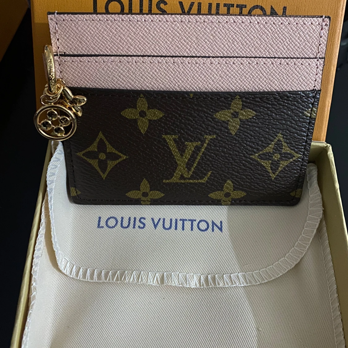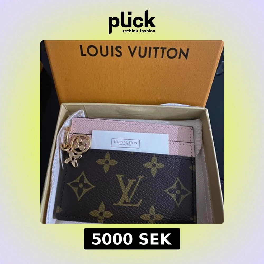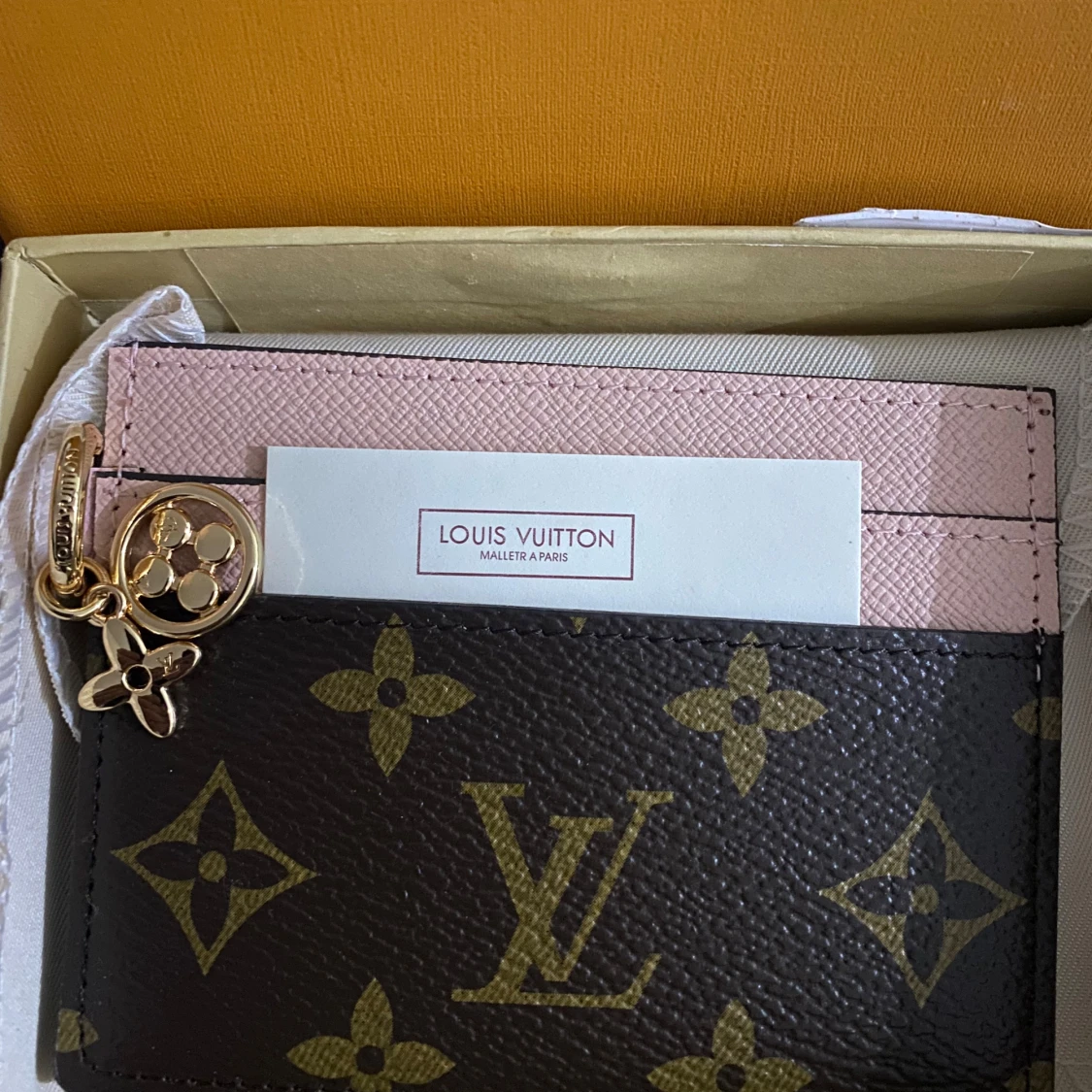 Supersnygg plånbok från Louis Vuitton med klassiskt monogrammönster i brunt och guld. Framsidan har LV-logga och blommor, baksidan är ljusrosa. Plånboken har guldfärgade detaljer och charm, perfekt för kort och cash❤️