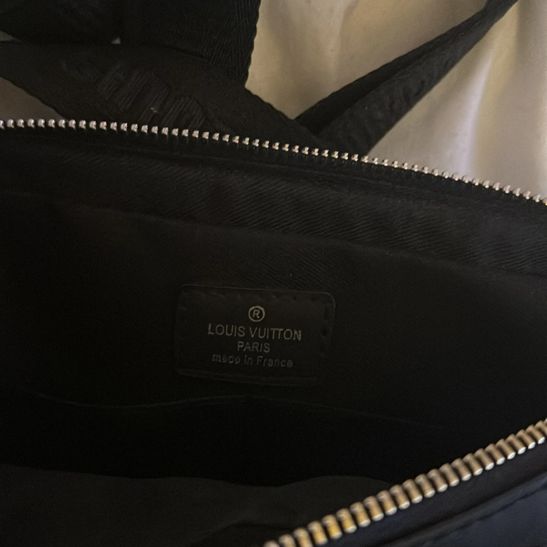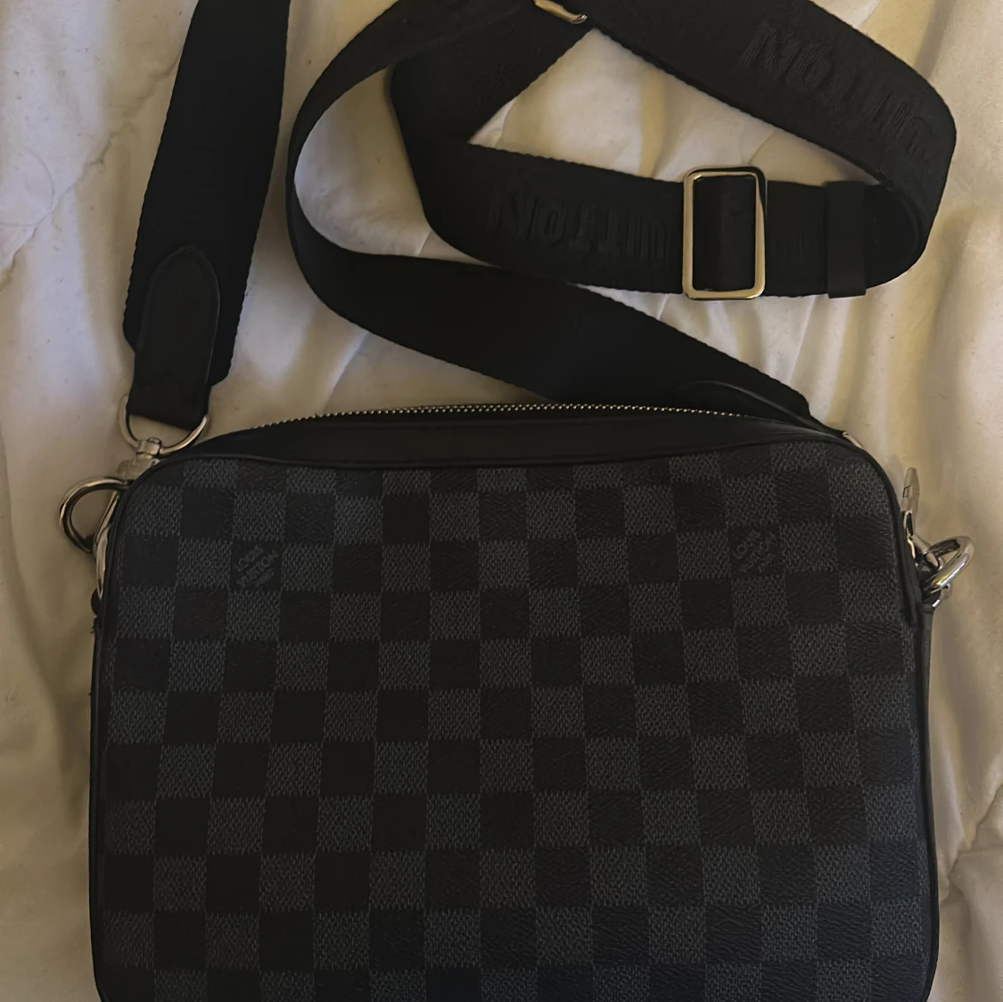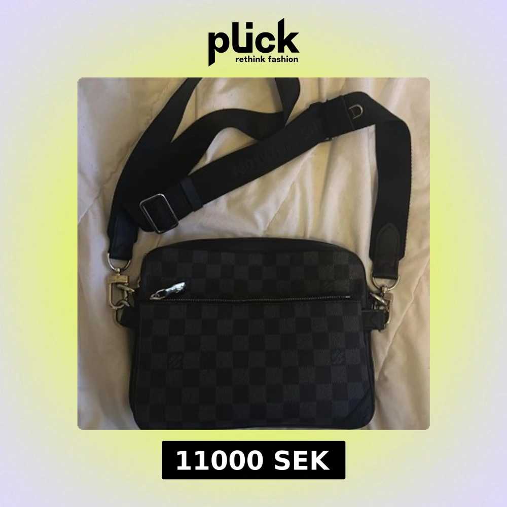 Säljer en snygg axelväska från Louis Vuitton med klassiskt rutigt mönster i svart och grått. Väskan har justerbar axelrem med Louis Vuitton-logga, silverfärgade metalldetaljer och dragkedja upptill. Perfekt storlek för dina viktigaste grejer.