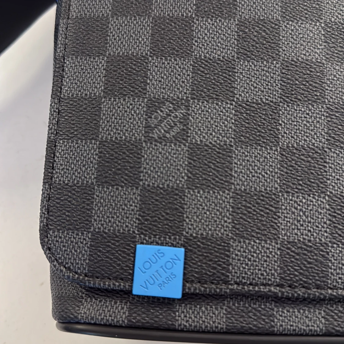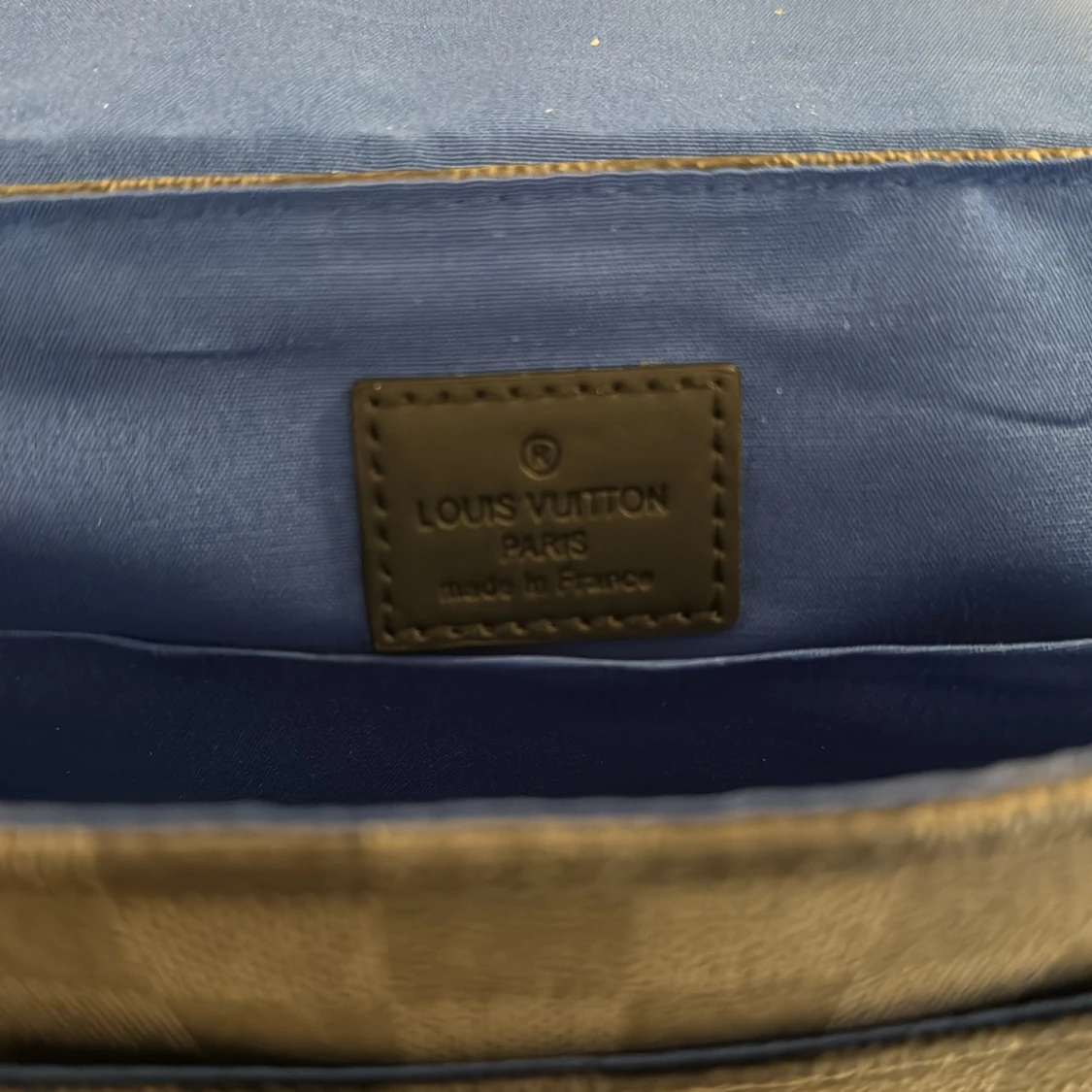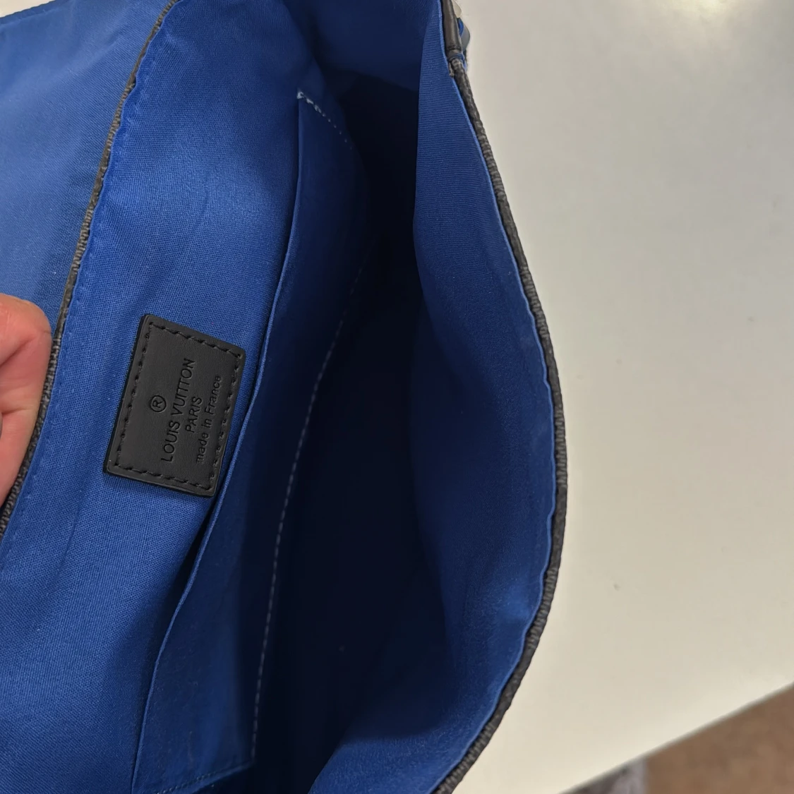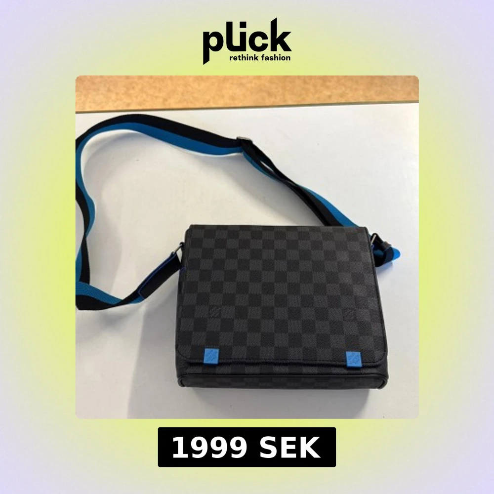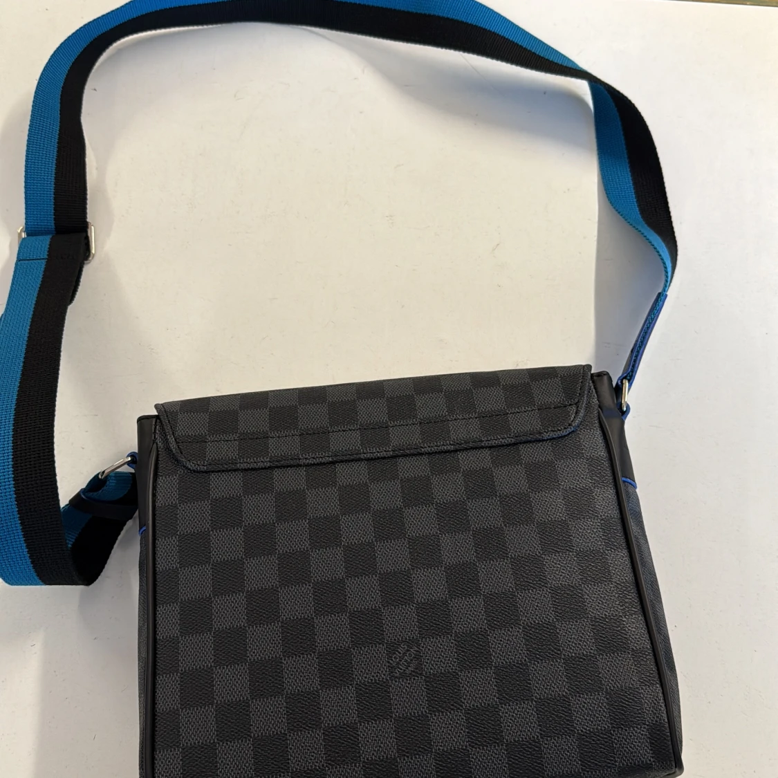 Snygg axelväska från Louis Vuitton i svart och grått med klassiskt rutigt mönster. Väskan har en bred axelrem i svart och blått, samt blå detaljer. Insidan är fodrad i blått tyg och har innerfack. Perfekt för dig som vill ha en stilren och modern väska.