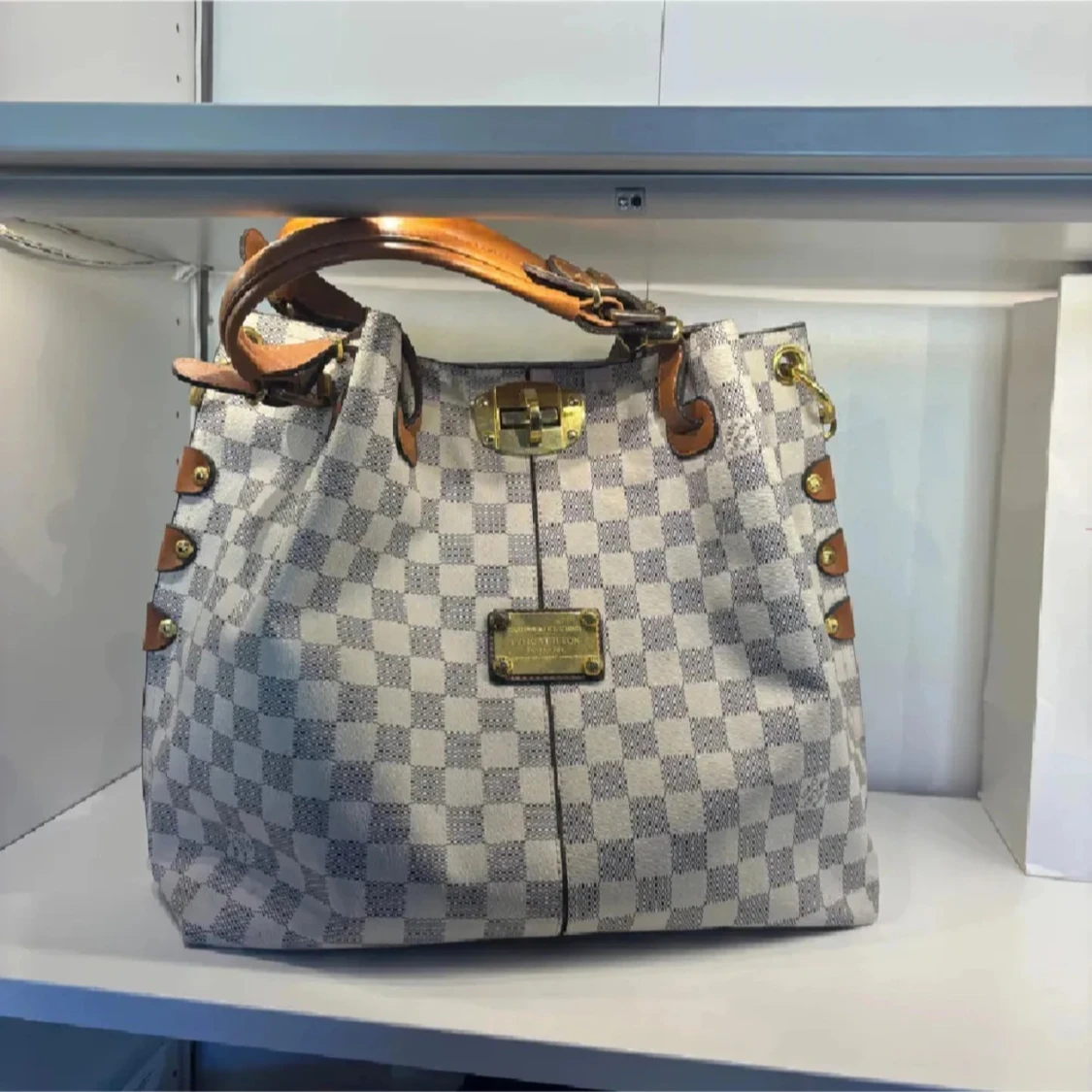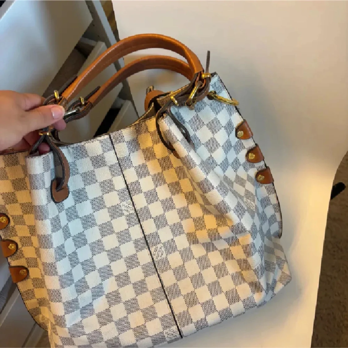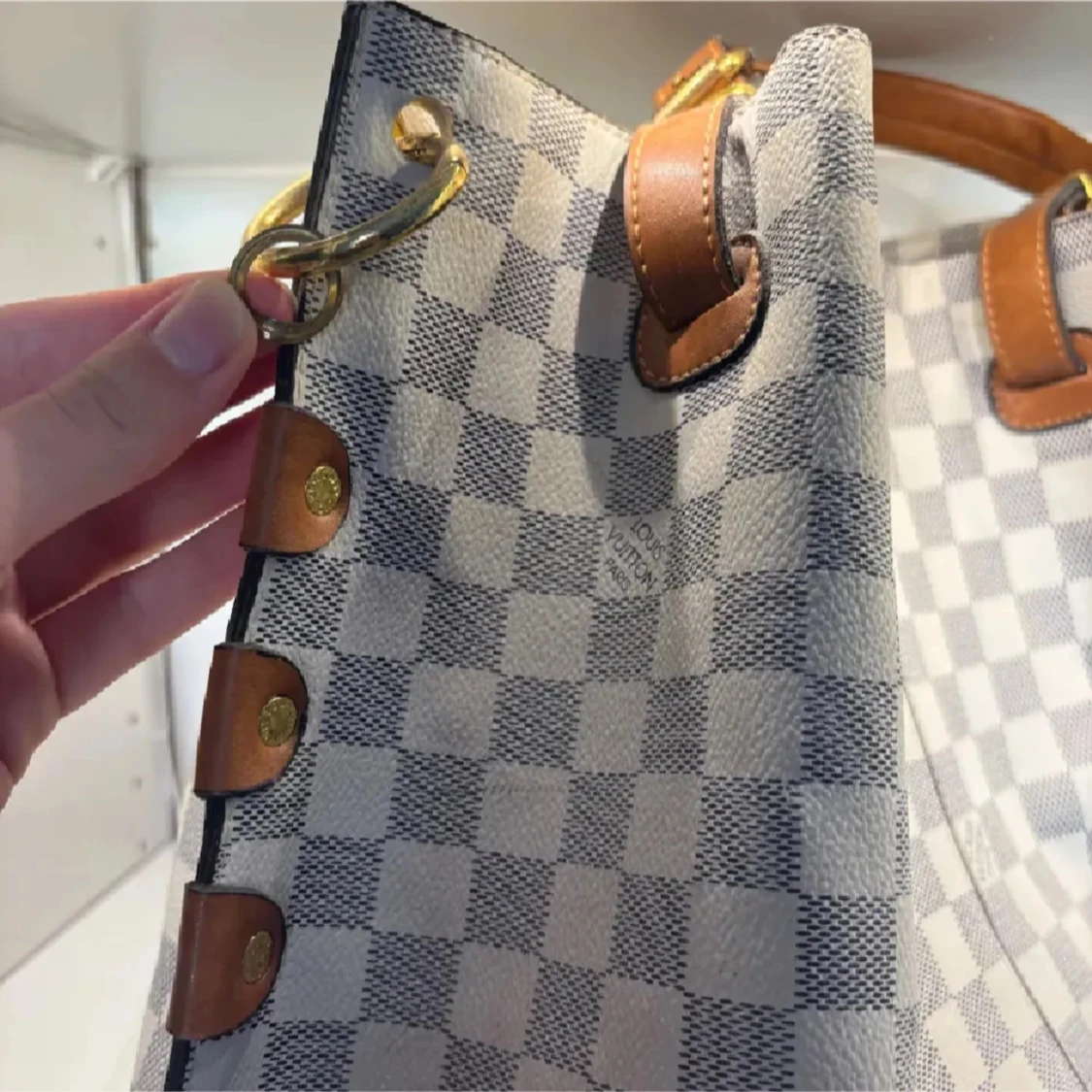 Snygg handväska från Louis Vuitton med klassiskt rutigt mönster i vitt och grått. Väskan har bruna skinnhandtag, guldfärgade metalldetaljer och dekorativa nitar på sidorna. Perfekt storlek för att få plats med allt du behöver och en lyxig känsla.