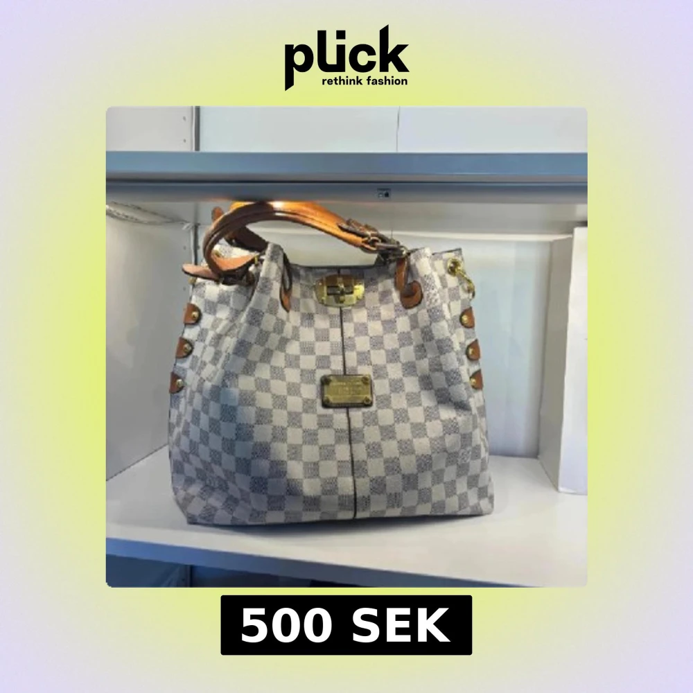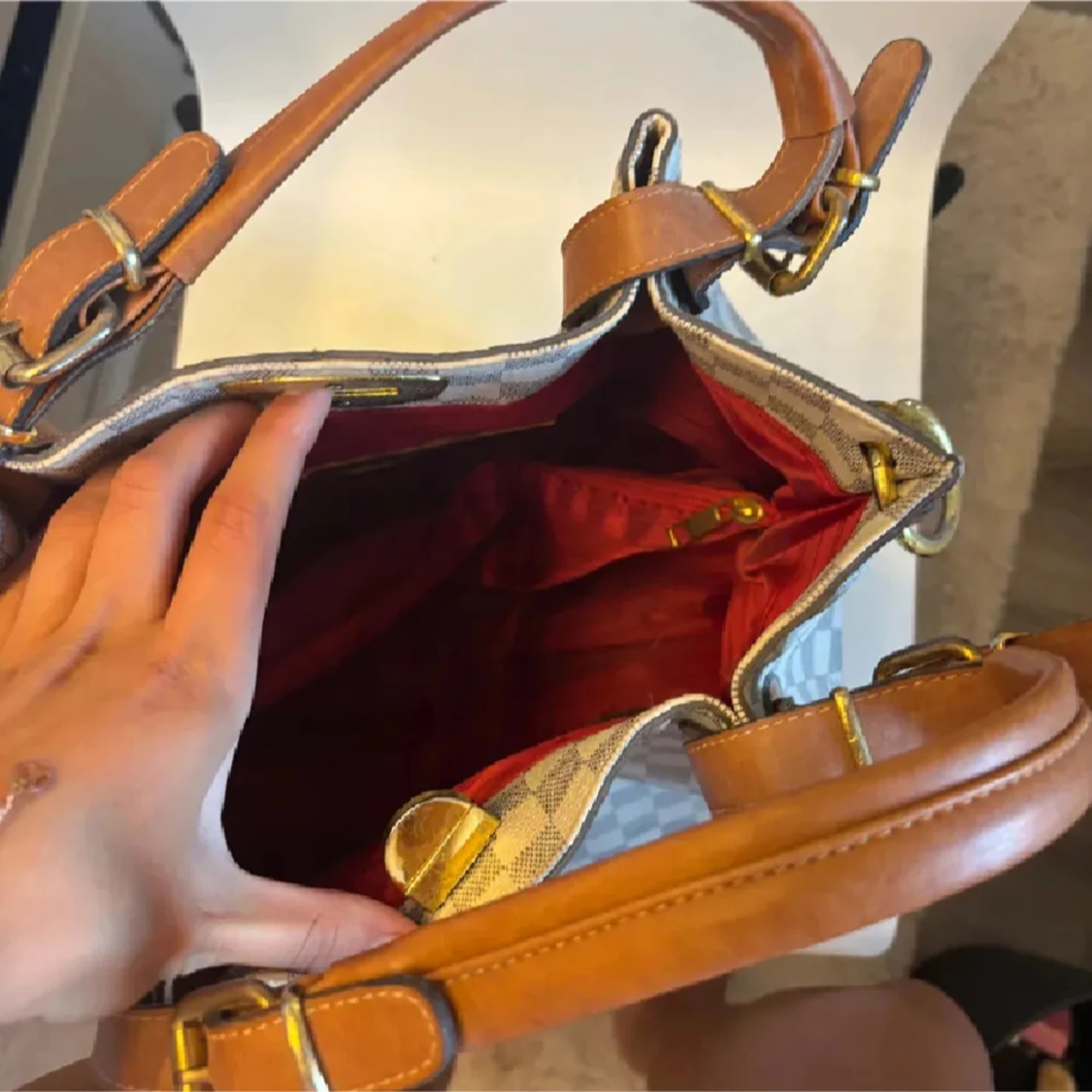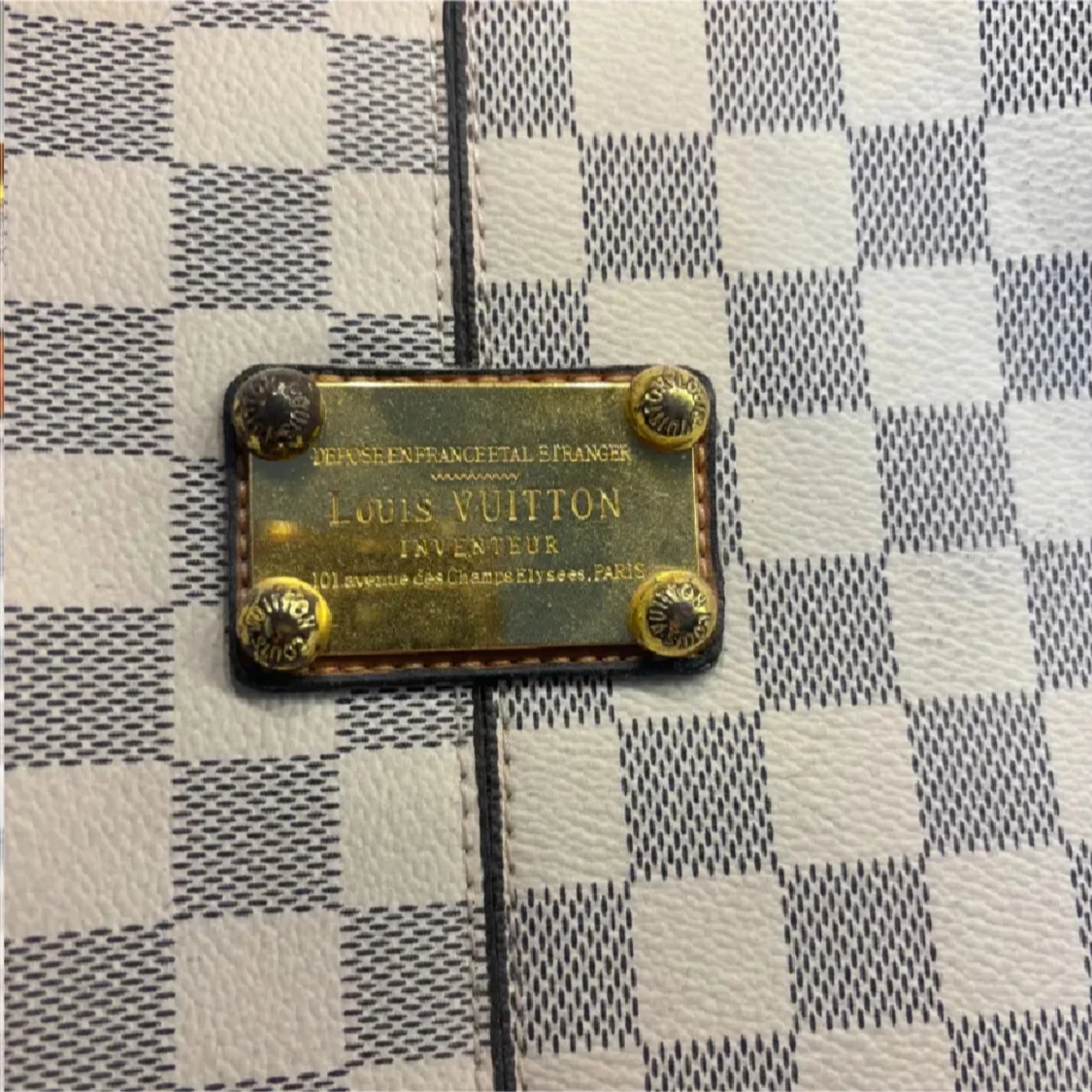 Snygg handväska från Louis Vuitton med klassiskt rutigt mönster i vitt och grått. Väskan har bruna skinnhandtag, guldfärgade metalldetaljer och dekorativa nitar på sidorna. Perfekt storlek för att få plats med allt du behöver och en lyxig känsla.