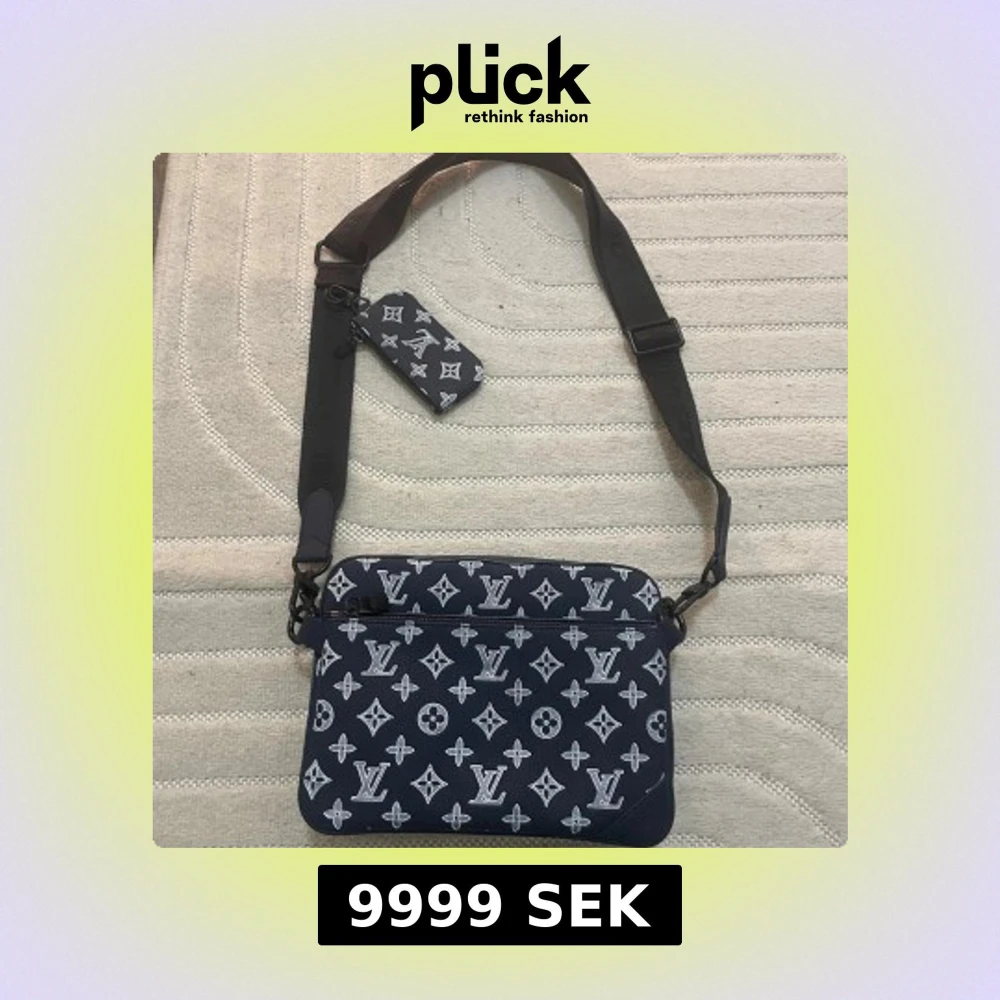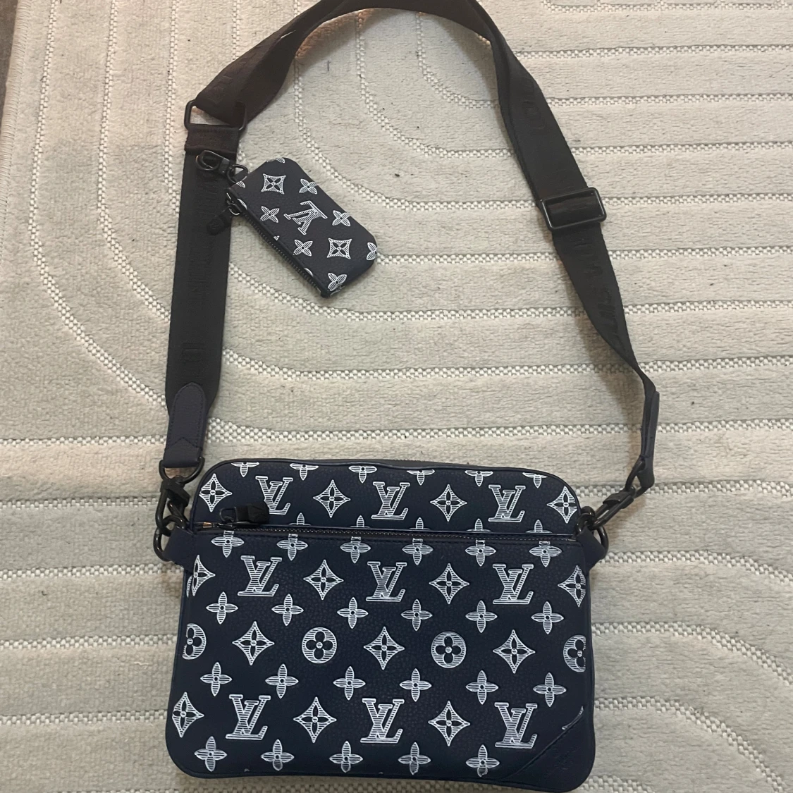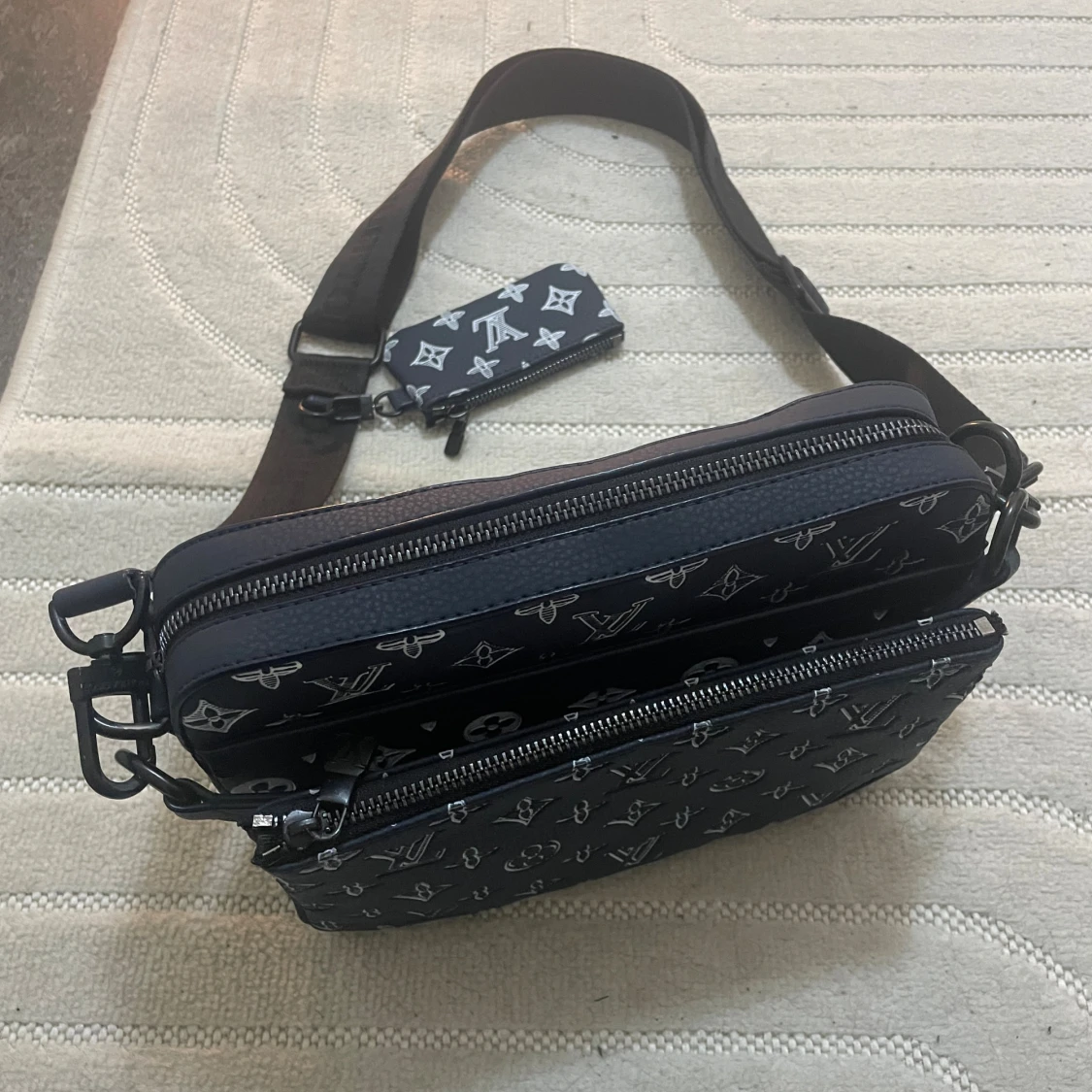 Snygg svart axelväska från Louis Vuitton med klassiskt vitt monogrammönster. Väskan har två stora fack med dragkedja, bred justerbar axelrem och en liten matchande pouch. Tillverkad i skinn med stilren och modern look.